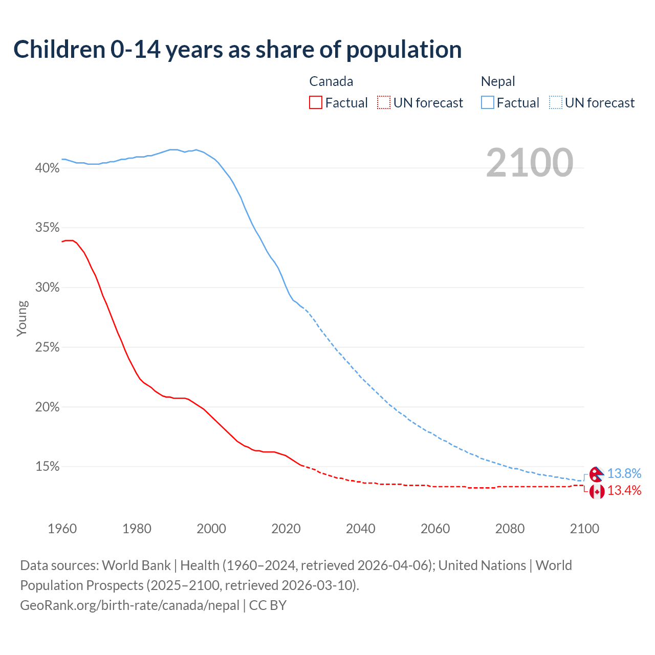 According to the latest available data on birth rates, the fertility rate in Canada was 1.26 children per woman in 2023, compared to 1.98 in Nepal in 2023. The replacement level is considered to be 2.1 children per woman.