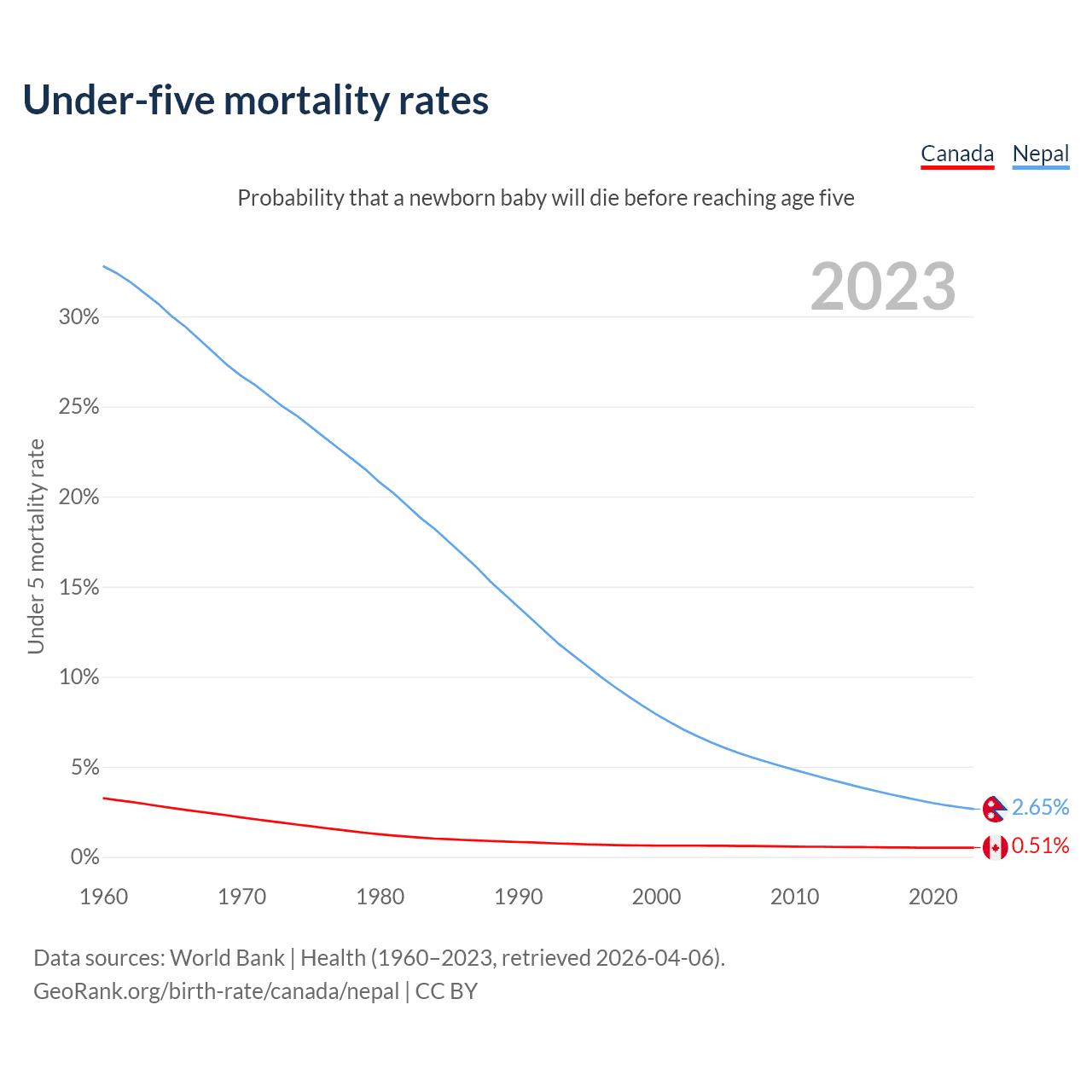 The chance that a newborn baby will die before reaching age five is 0.51% in Canada and 2.65% in Nepal. Above is a chart with historical data on under-five mortality rates.