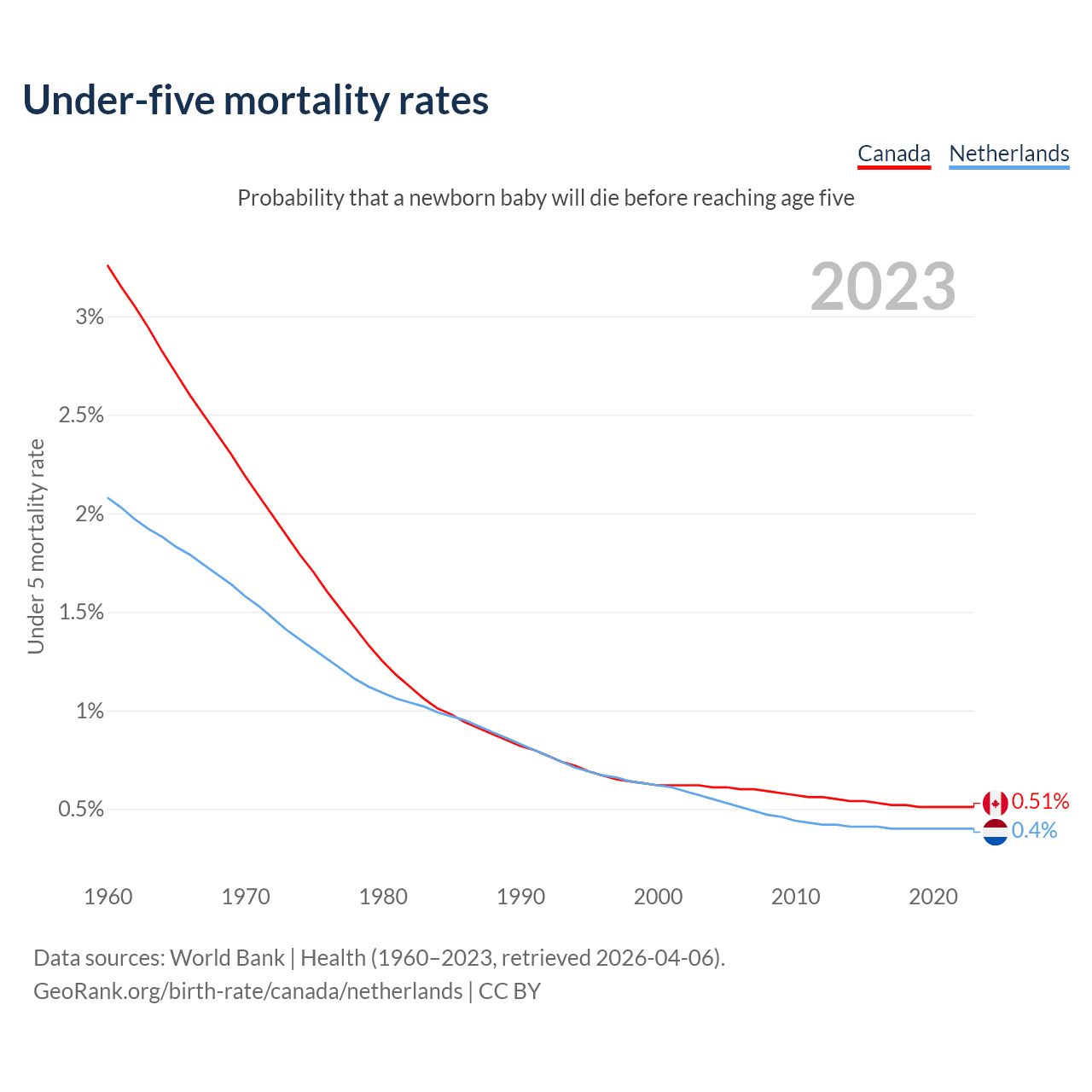 The chance that a newborn baby will die before reaching age five is 0.51% in Canada and 0.4% in the Netherlands. Above is a chart with historical data on under-five mortality rates.