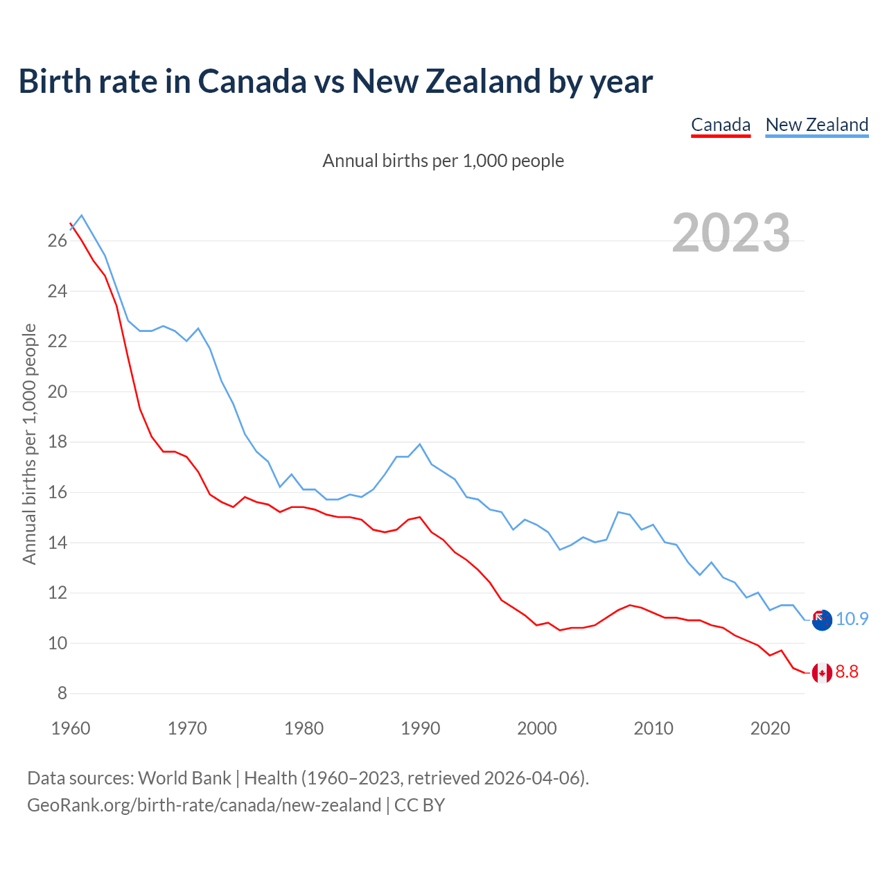 Canada has an annual birth rate of 8.8 births per 1,000 people, compared to 10.9 for New Zealand. The average number of children a woman is expected to have during her lifetime — the fertility rate, is 1.26 in Canada and 1.56 in New Zealand — 23.8% difference.