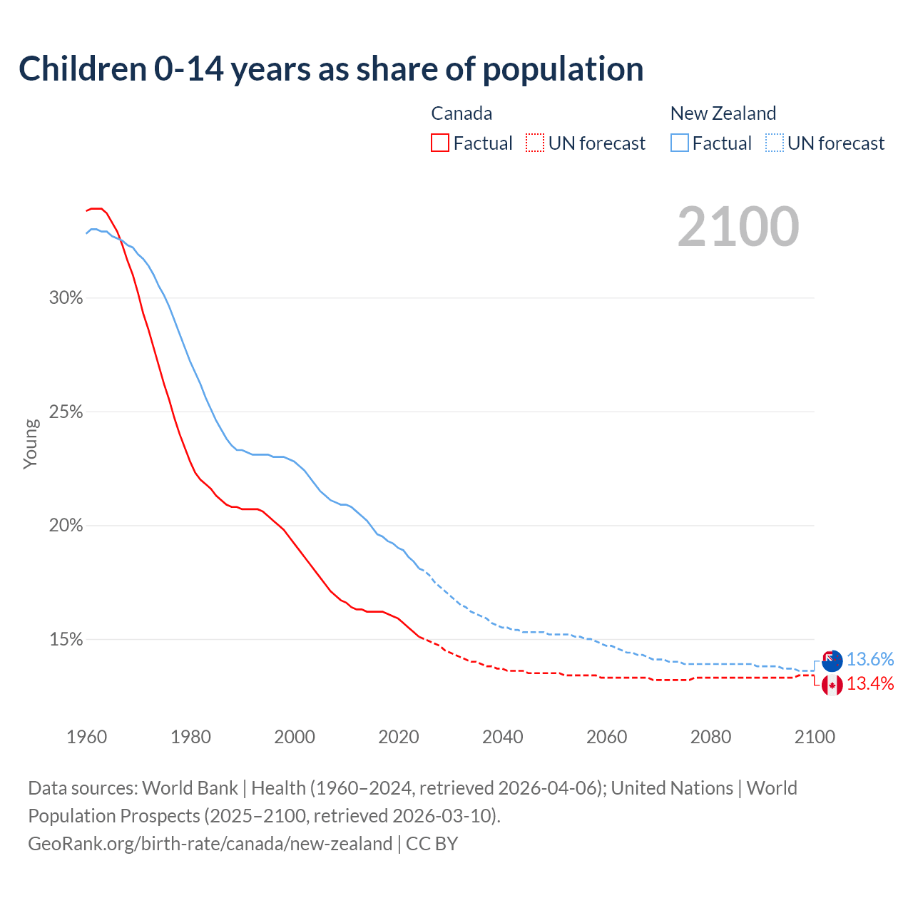 According to the latest available data on birth rates, the fertility rate in Canada was 1.26 children per woman in 2023, compared to 1.56 in New Zealand in 2023. The replacement level is considered to be 2.1 children per woman.