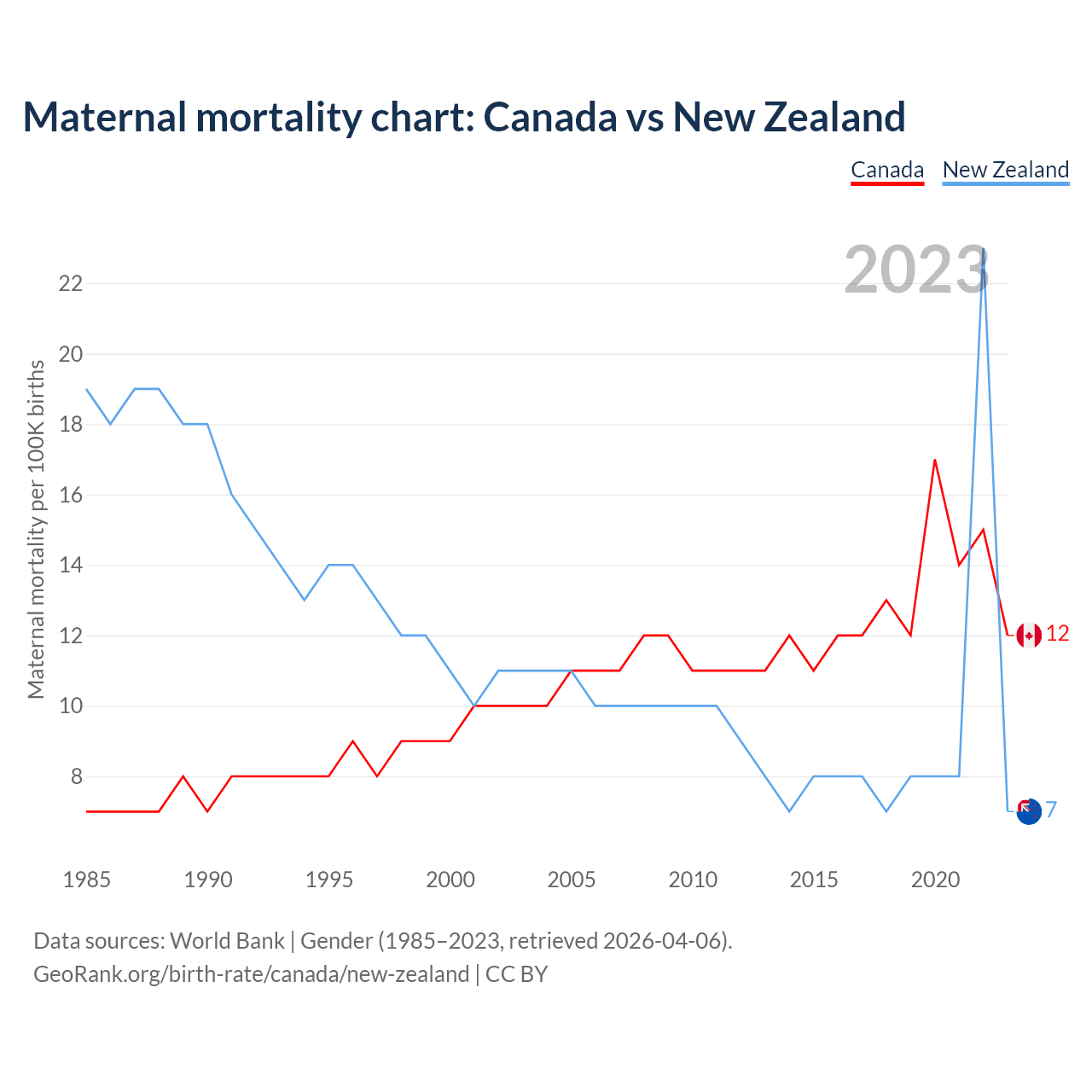 The maternal mortality rate, which is the probability of dying during childbirth or within 42 days of pregnancy termination, is 12 deaths per 100,000 live births in Canada, compared to 7 deaths in New Zealand.