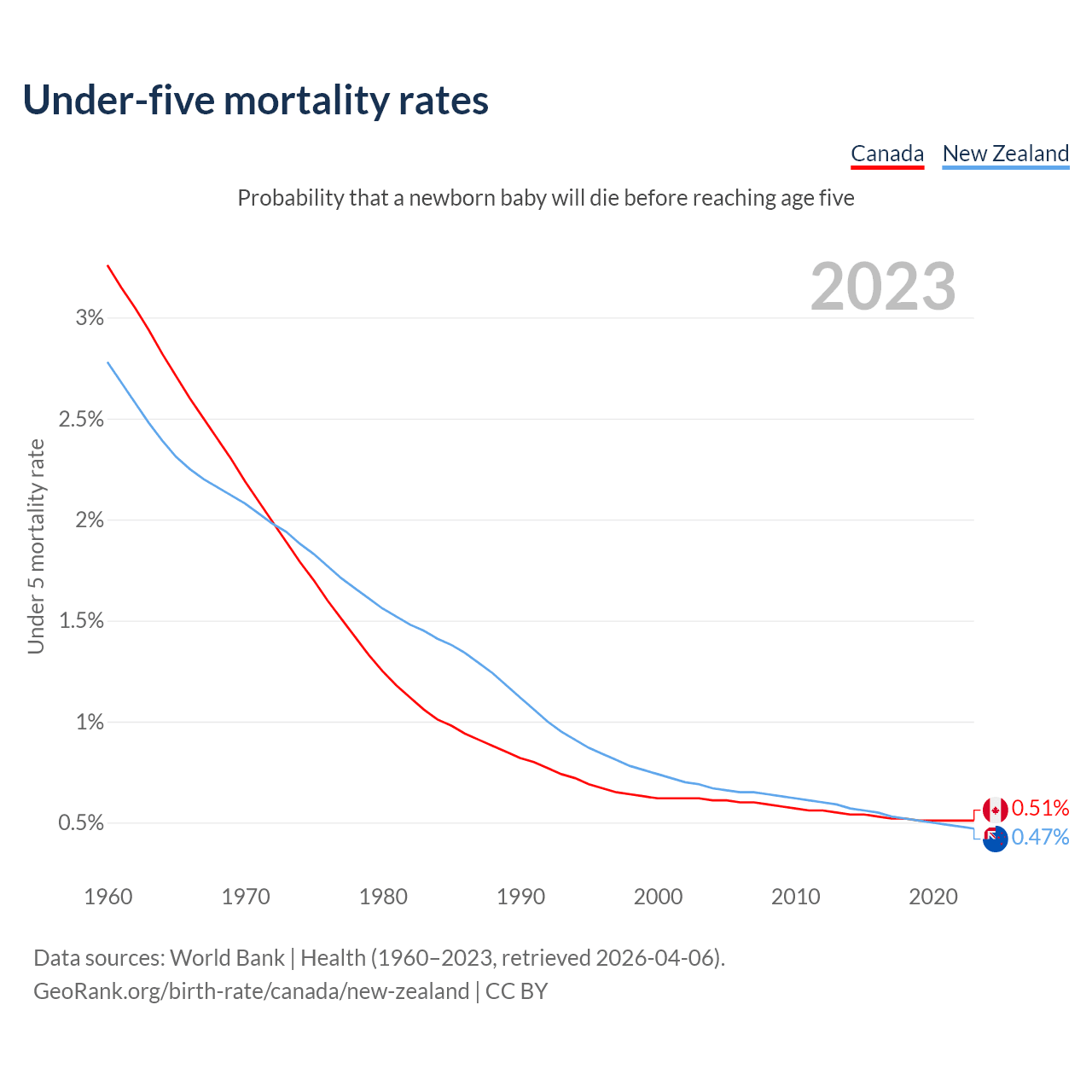 The chance that a newborn baby will die before reaching age five is 0.51% in Canada and 0.47% in New Zealand. Above is a chart with historical data on under-five mortality rates.
