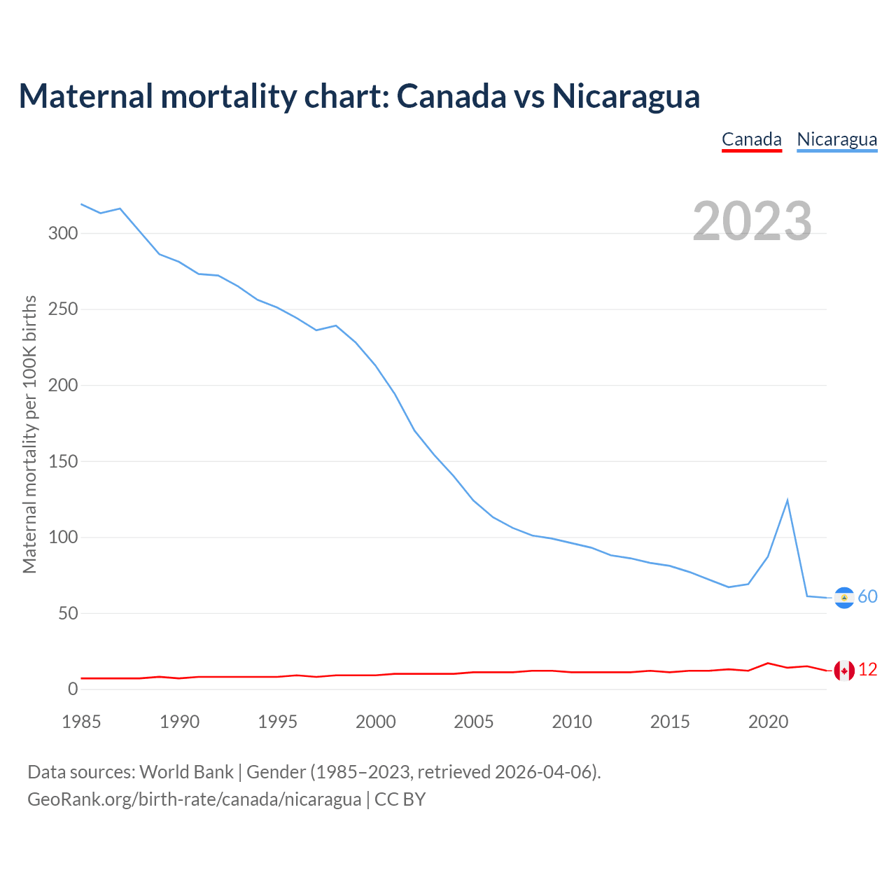 The maternal mortality rate, which is the probability of dying during childbirth or within 42 days of pregnancy termination, is 12 deaths per 100,000 live births in Canada, compared to 60 deaths in Nicaragua.