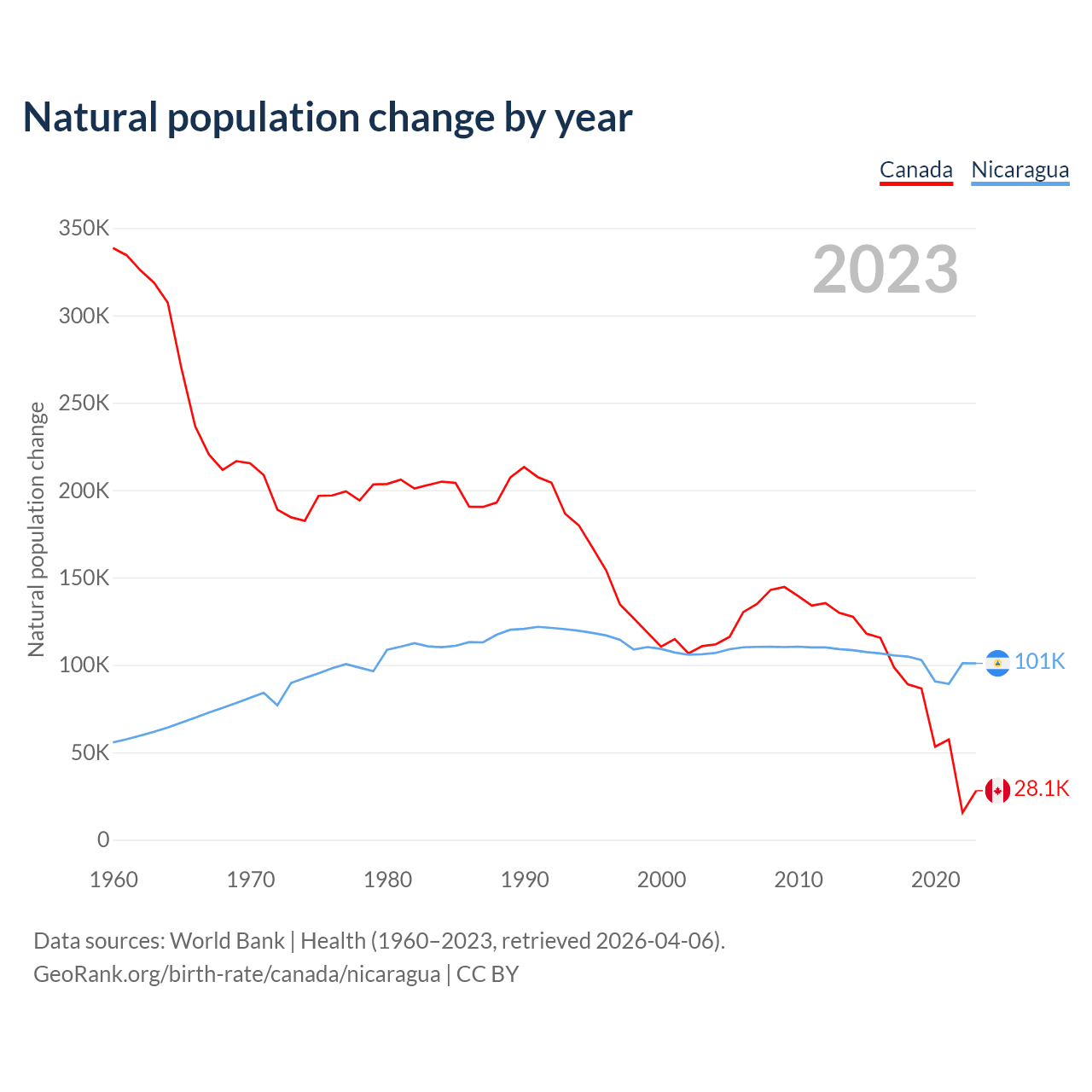 Canada has an annual birth rate of 8.8 births per 1,000 people, compared to 19.4 for Nicaragua. The average number of children a woman is expected to have during her lifetime — the fertility rate, is 1.26 in Canada and 2.22 in Nicaragua — 76% difference.