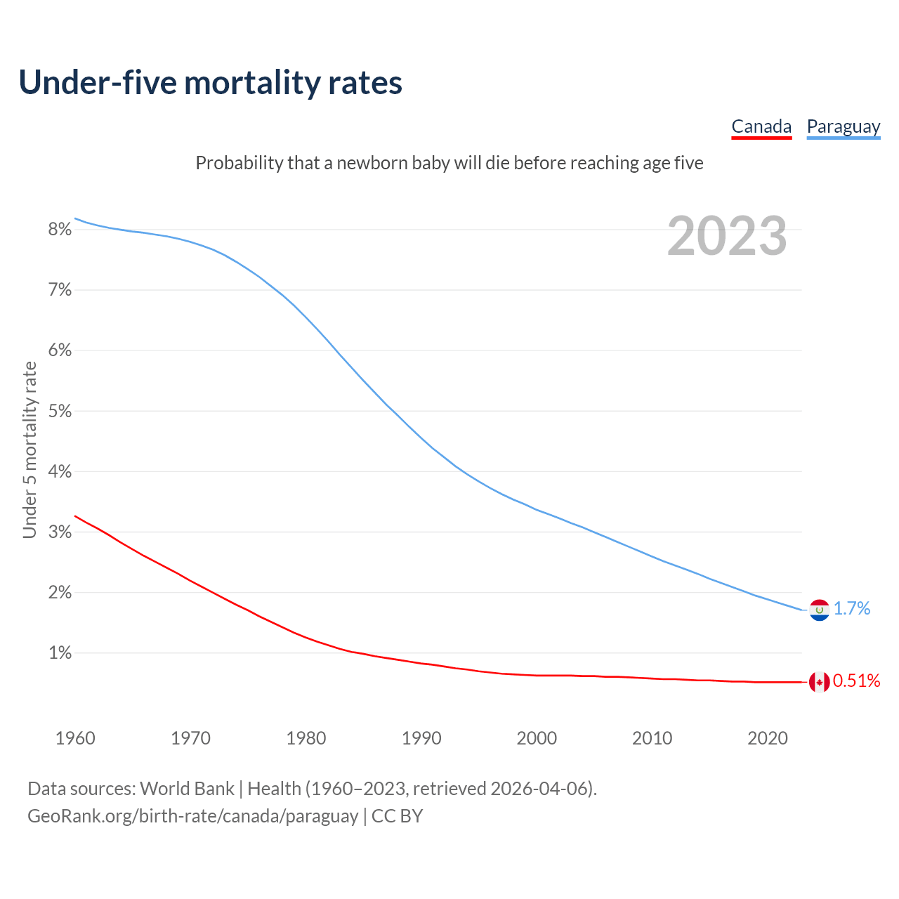 The chance that a newborn baby will die before reaching age five is 0.51% in Canada and 1.7% in Paraguay. Above is a chart with historical data on under-five mortality rates.