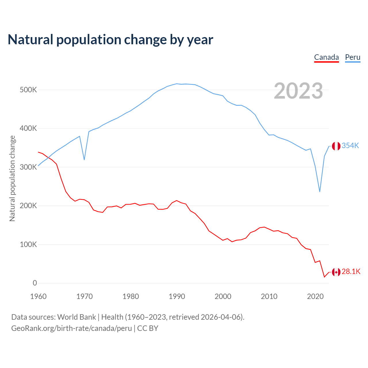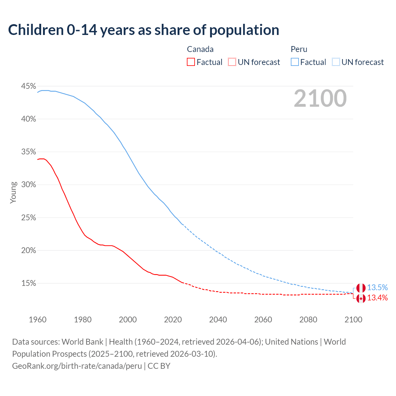 According to the latest available data on birth rates, the fertility rate in Canada was 1.26 children per woman in 2023, compared to 1.98 in Peru in 2023. The replacement level is considered to be 2.1 children per woman.