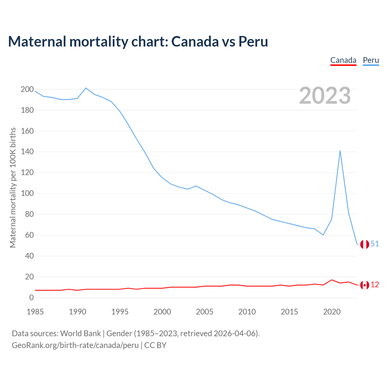 The maternal mortality rate, which is the probability of dying during childbirth or within 42 days of pregnancy termination, is 12 deaths per 100,000 live births in Canada, compared to 51 deaths in Peru.