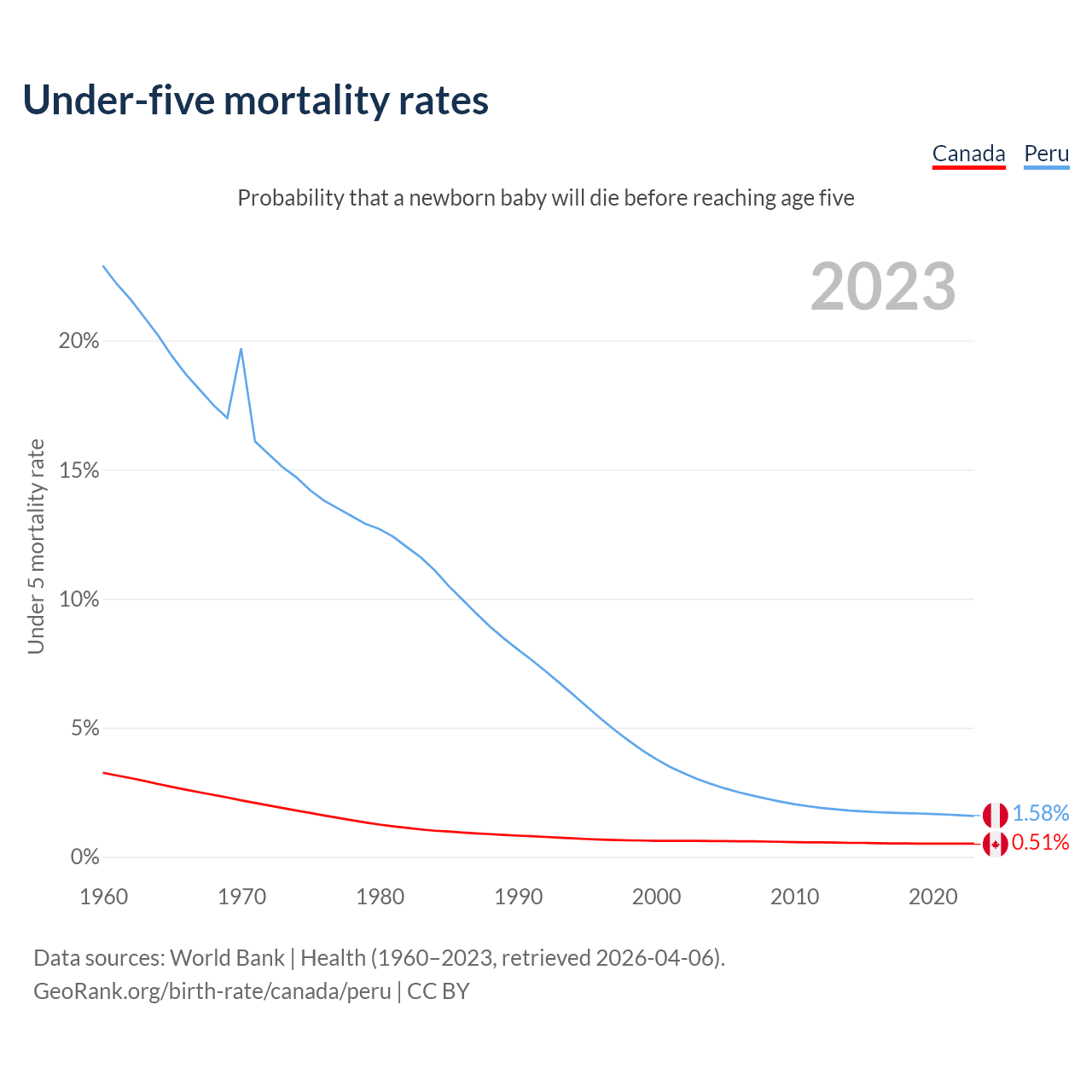The chance that a newborn baby will die before reaching age five is 0.51% in Canada and 1.58% in Peru. Above is a chart with historical data on under-five mortality rates.