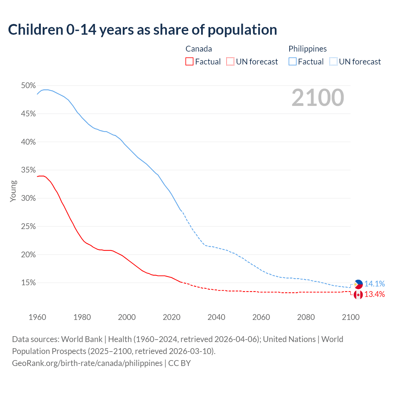 Canada has an annual birth rate of 8.8 births per 1,000 people, compared to 16 for the Philippines. The average number of children a woman is expected to have during her lifetime — the fertility rate, is 1.26 in Canada and 1.92 in the Philippines — 52.1% difference.