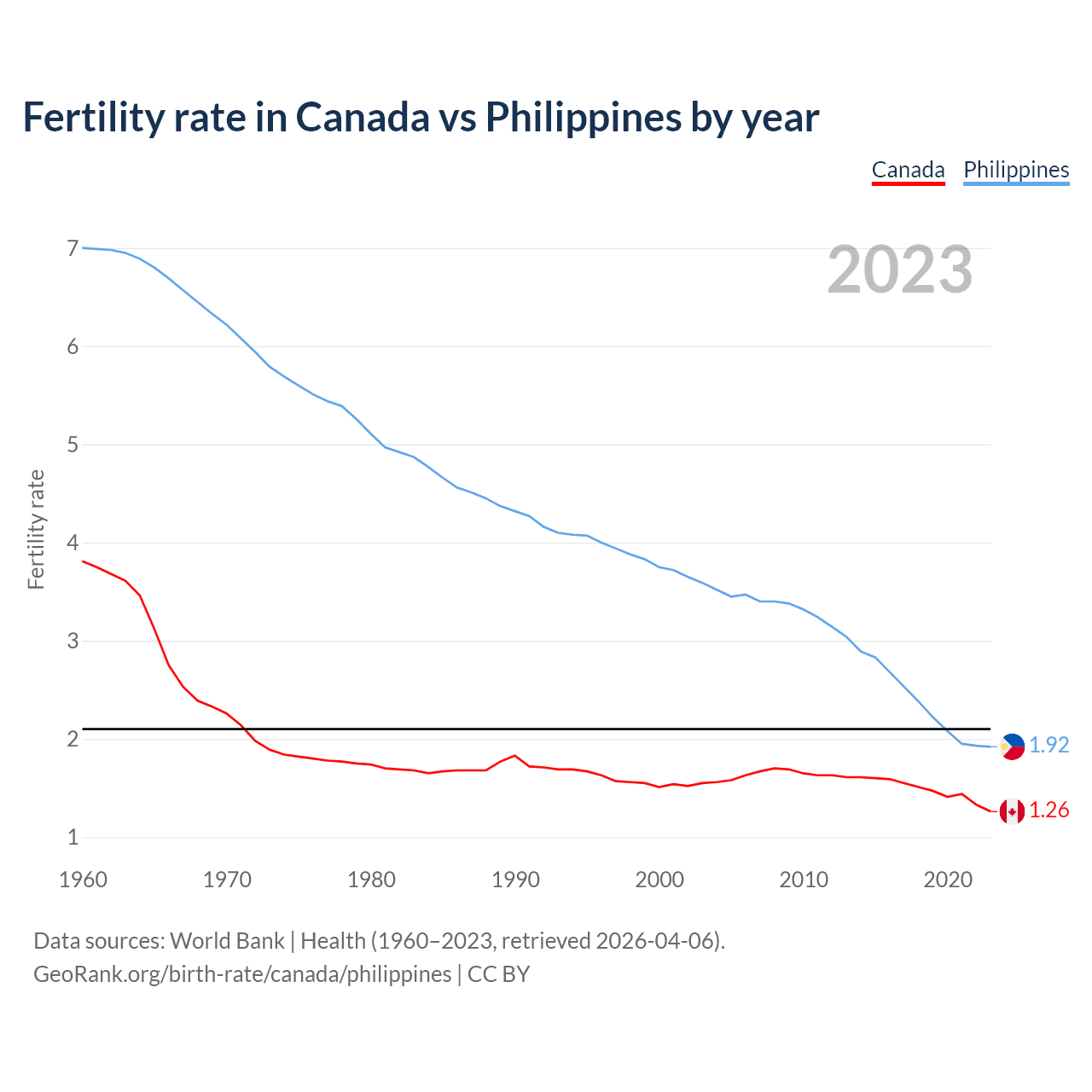 According to the latest available data on birth rates, the fertility rate in Canada was 1.26 children per woman in 2023, compared to 1.92 in the Philippines in 2023. The replacement level is considered to be 2.1 children per woman.