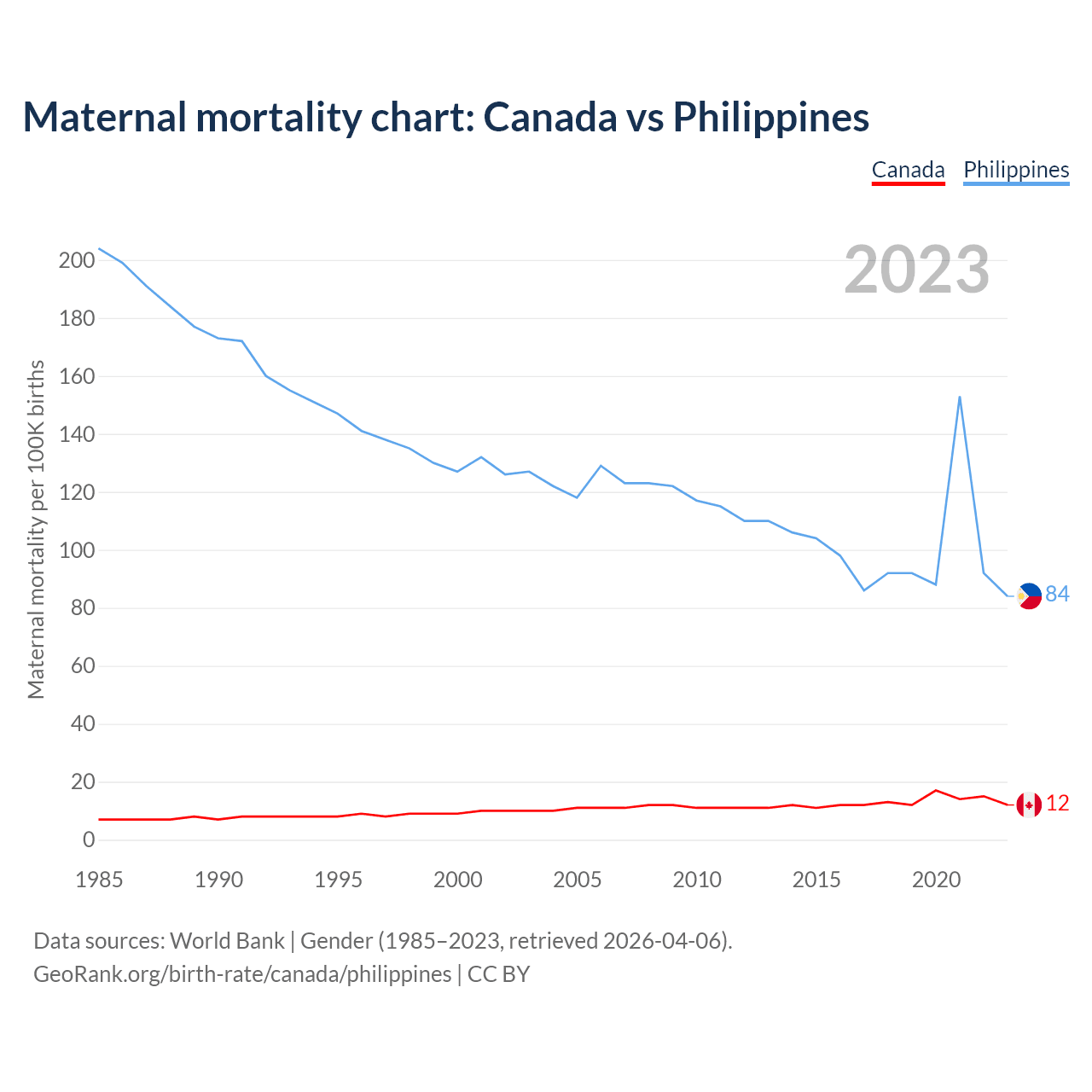The maternal mortality rate, which is the probability of dying during childbirth or within 42 days of pregnancy termination, is 12 deaths per 100,000 live births in Canada, compared to 84 deaths in the Philippines.