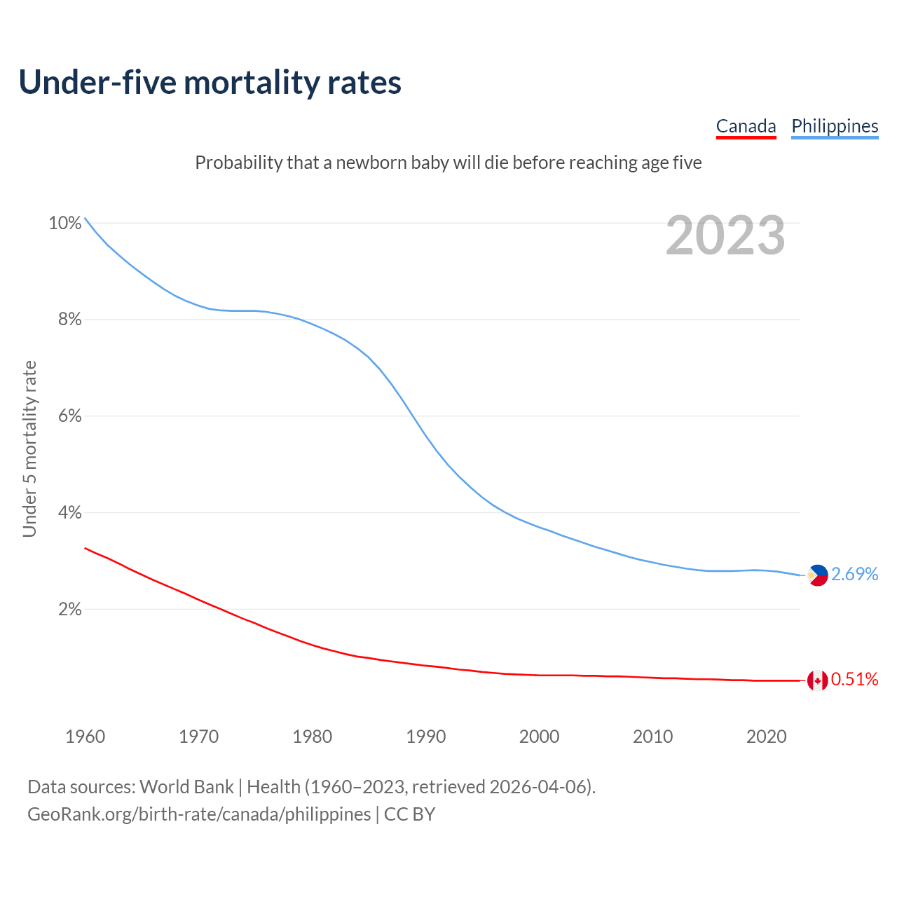 The chance that a newborn baby will die before reaching age five is 0.51% in Canada and 2.69% in the Philippines. Above is a chart with historical data on under-five mortality rates.