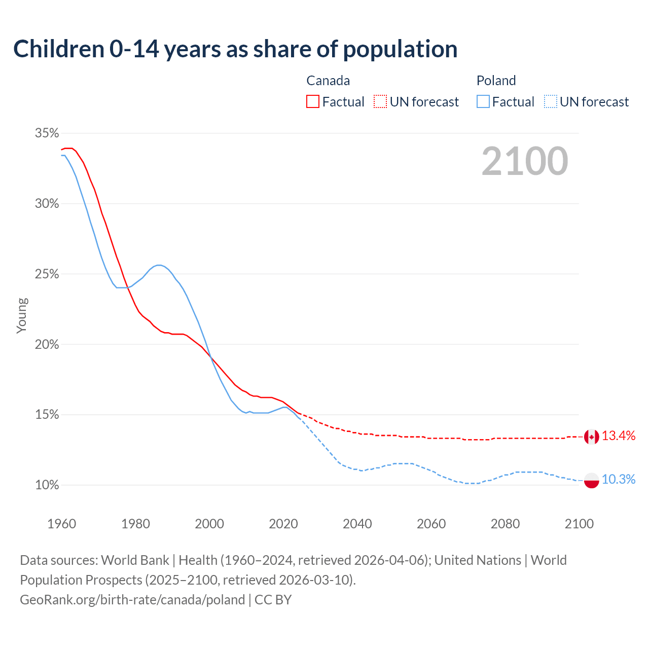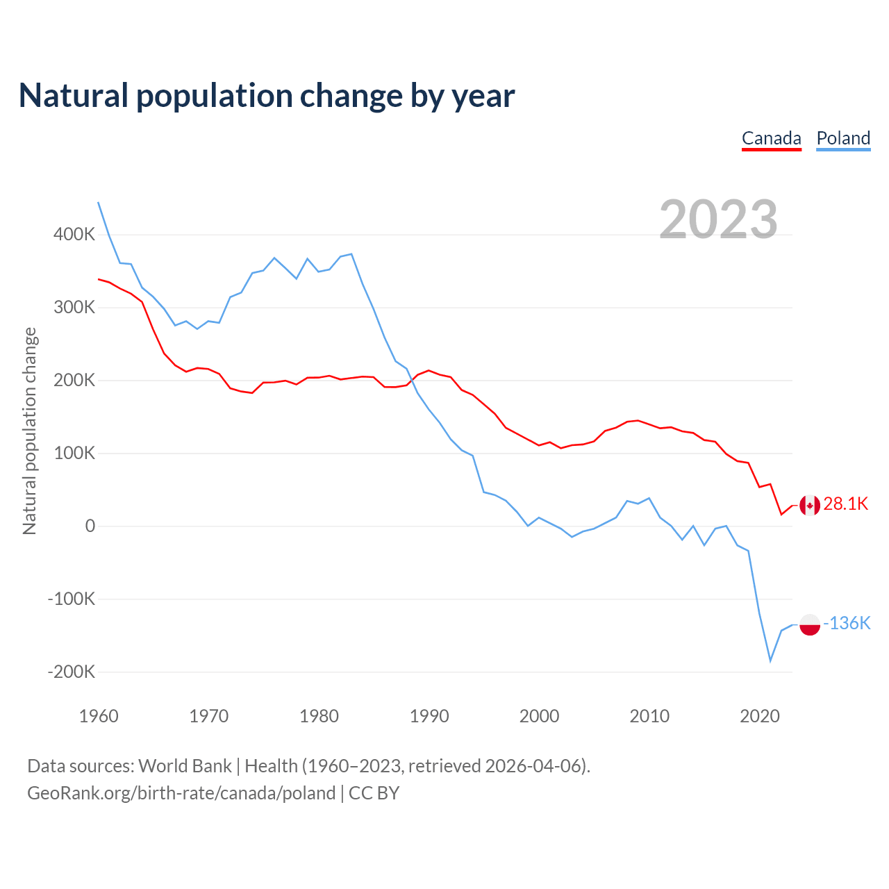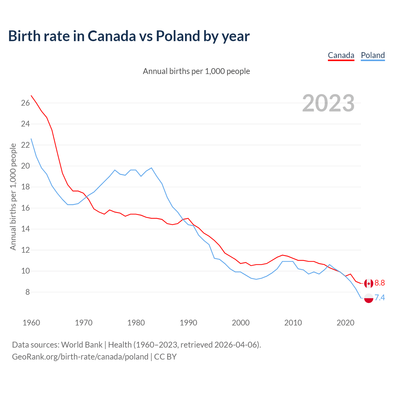 According to the latest available data on birth rates, the fertility rate in Canada was 1.26 children per woman in 2023, compared to 1.16 in Poland in 2023. The replacement level is considered to be 2.1 children per woman.