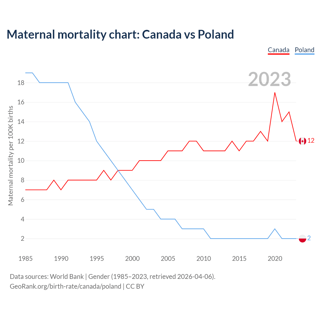 The maternal mortality rate, which is the probability of dying during childbirth or within 42 days of pregnancy termination, is 12 deaths per 100,000 live births in Canada, compared to 2 deaths in Poland.