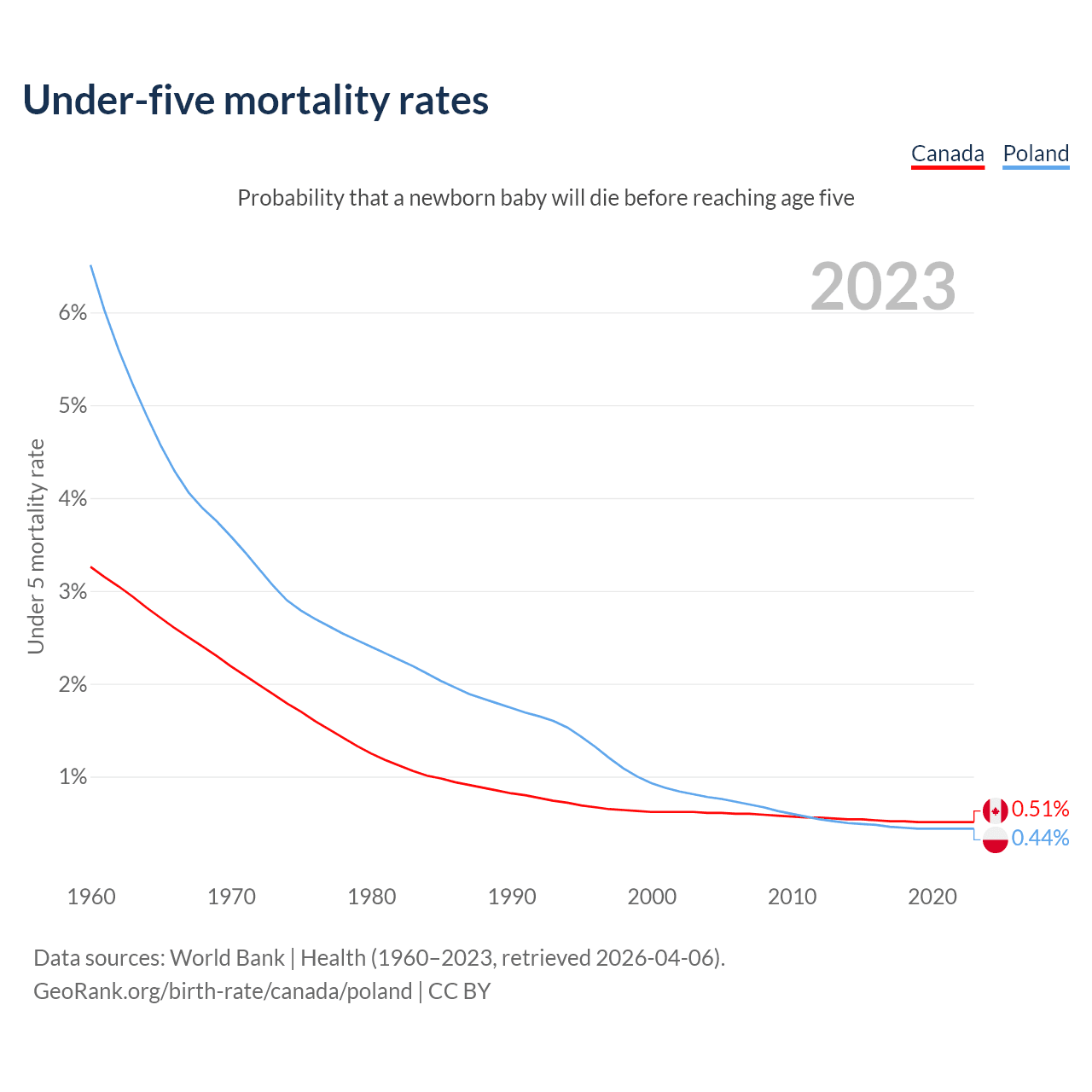 The chance that a newborn baby will die before reaching age five is 0.51% in Canada and 0.44% in Poland. Above is a chart with historical data on under-five mortality rates.
