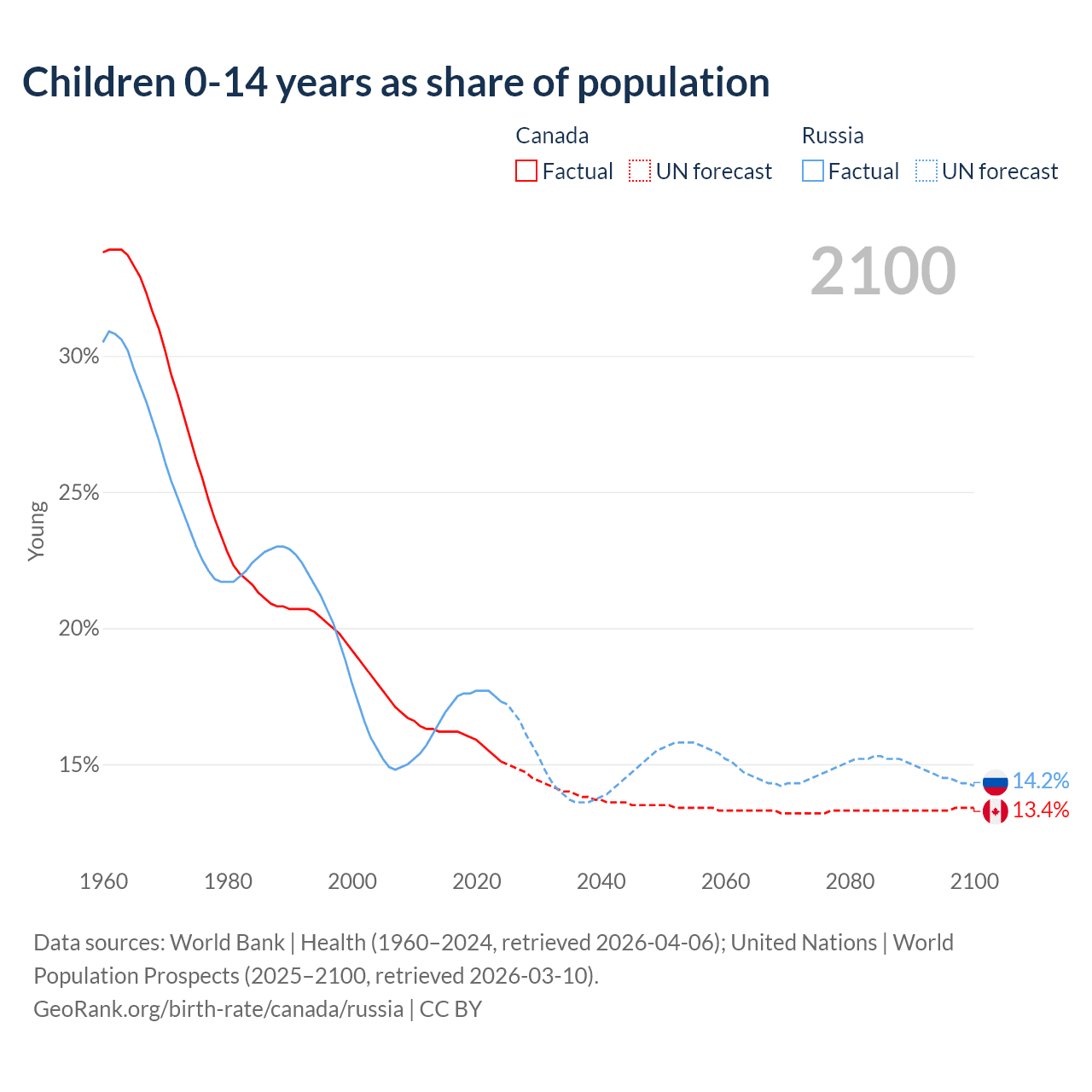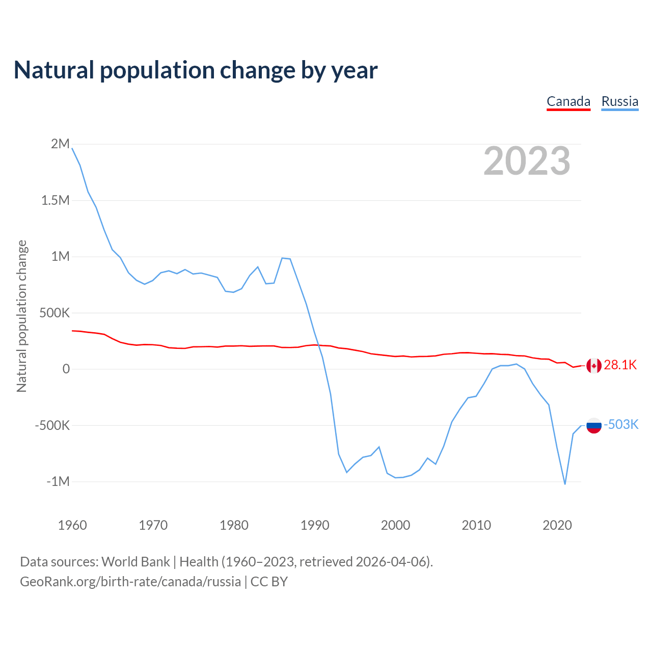 Canada has an annual birth rate of 8.8 births per 1,000 people, compared to 8.6 for Russia. The average number of children a woman is expected to have during her lifetime — the fertility rate, is 1.26 in Canada and 1.41 in Russia — 11.9% difference.