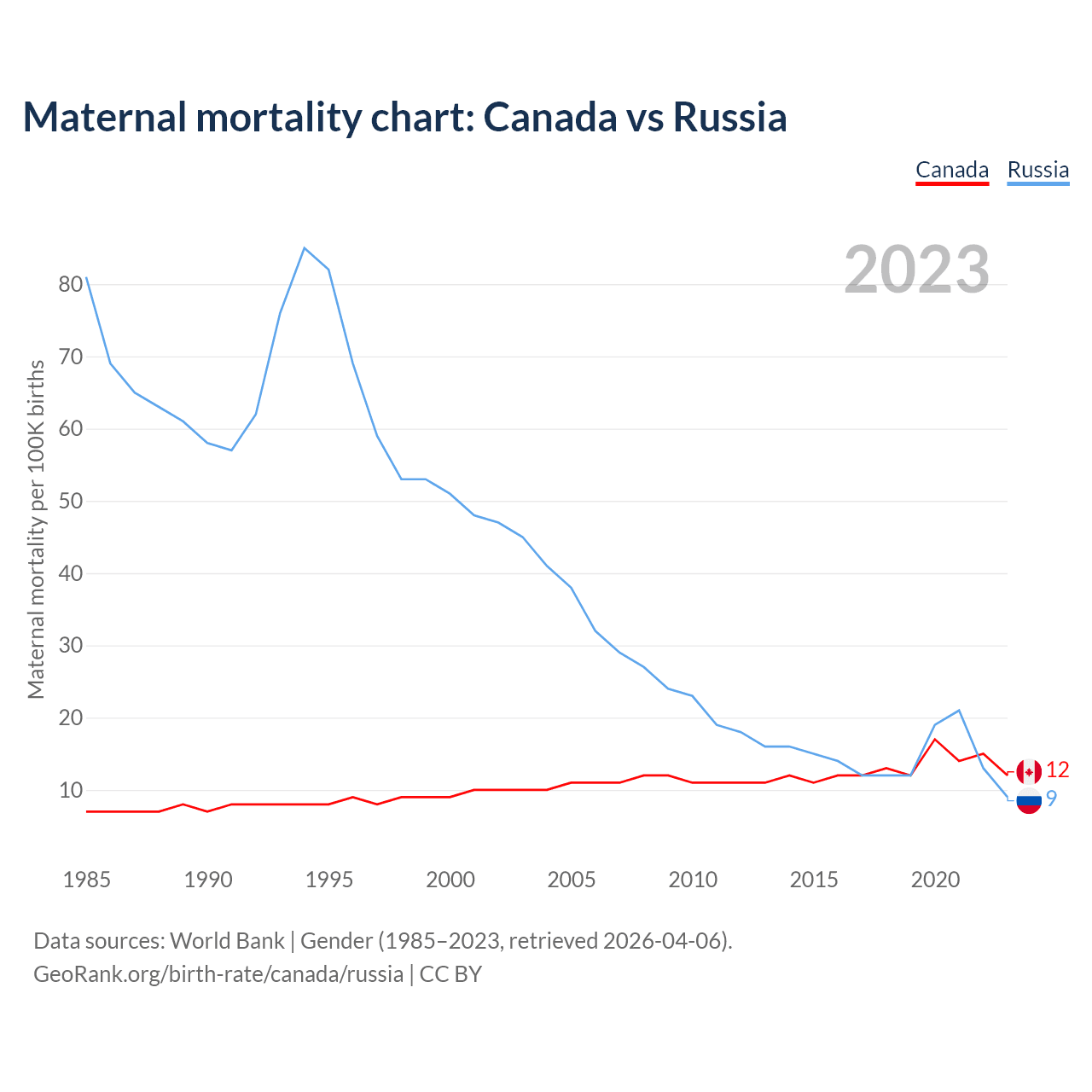 The maternal mortality rate, which is the probability of dying during childbirth or within 42 days of pregnancy termination, is 12 deaths per 100,000 live births in Canada, compared to 9 deaths in Russia.