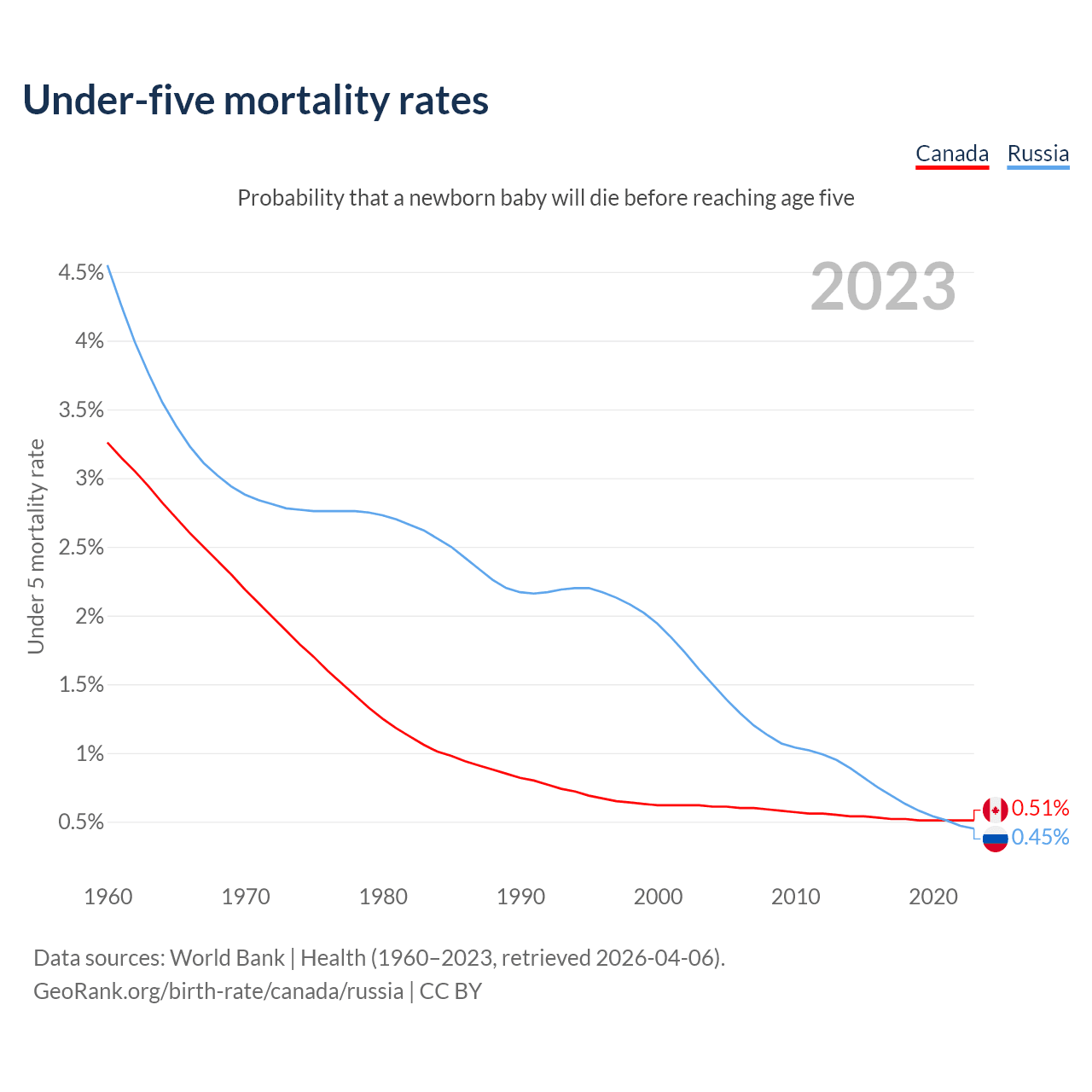 The chance that a newborn baby will die before reaching age five is 0.51% in Canada and 0.45% in Russia. Above is a chart with historical data on under-five mortality rates.