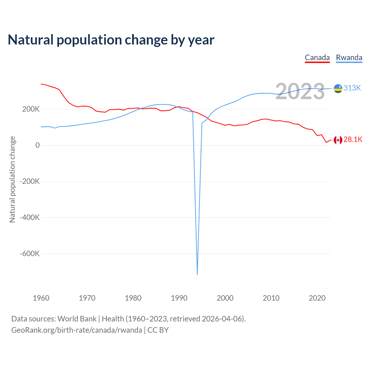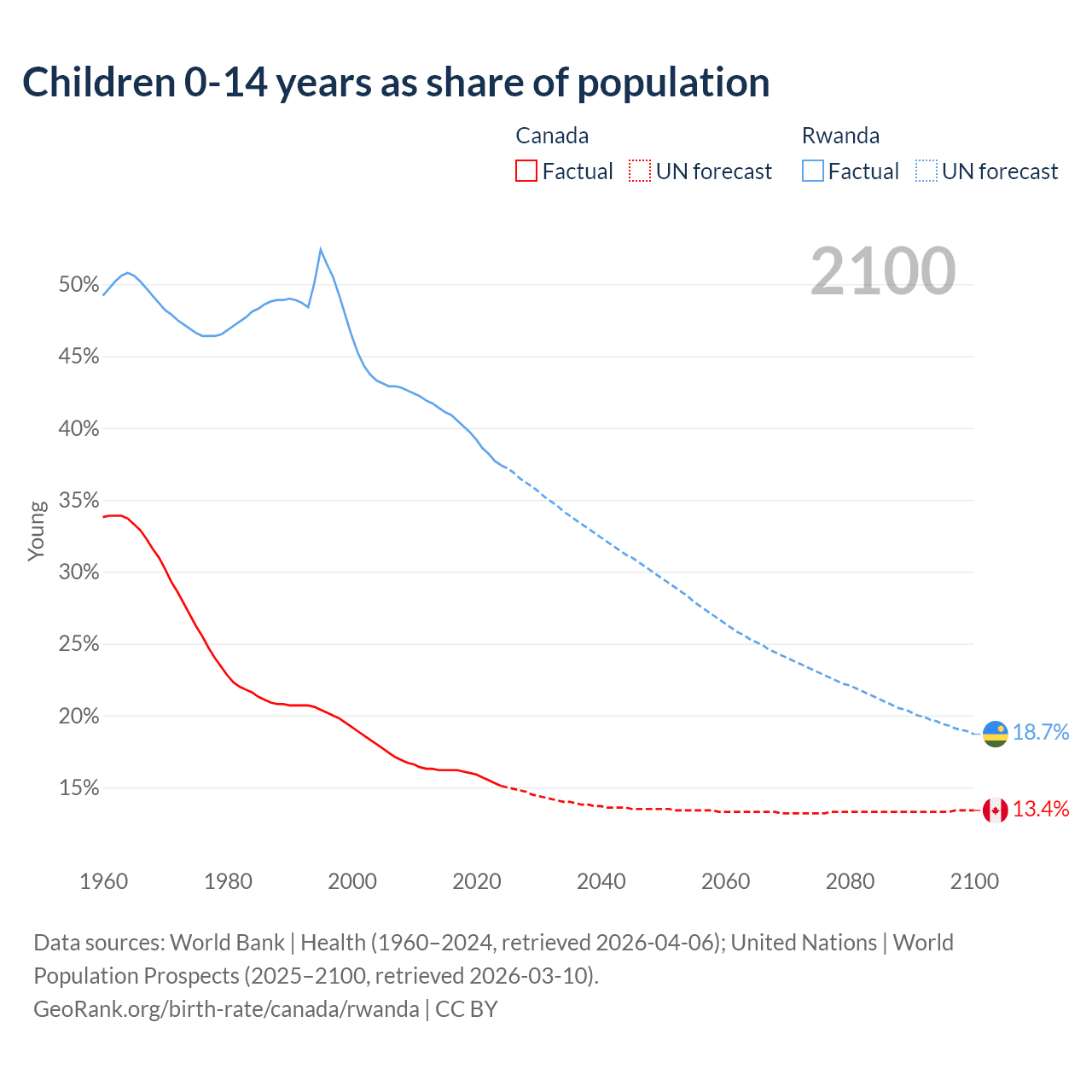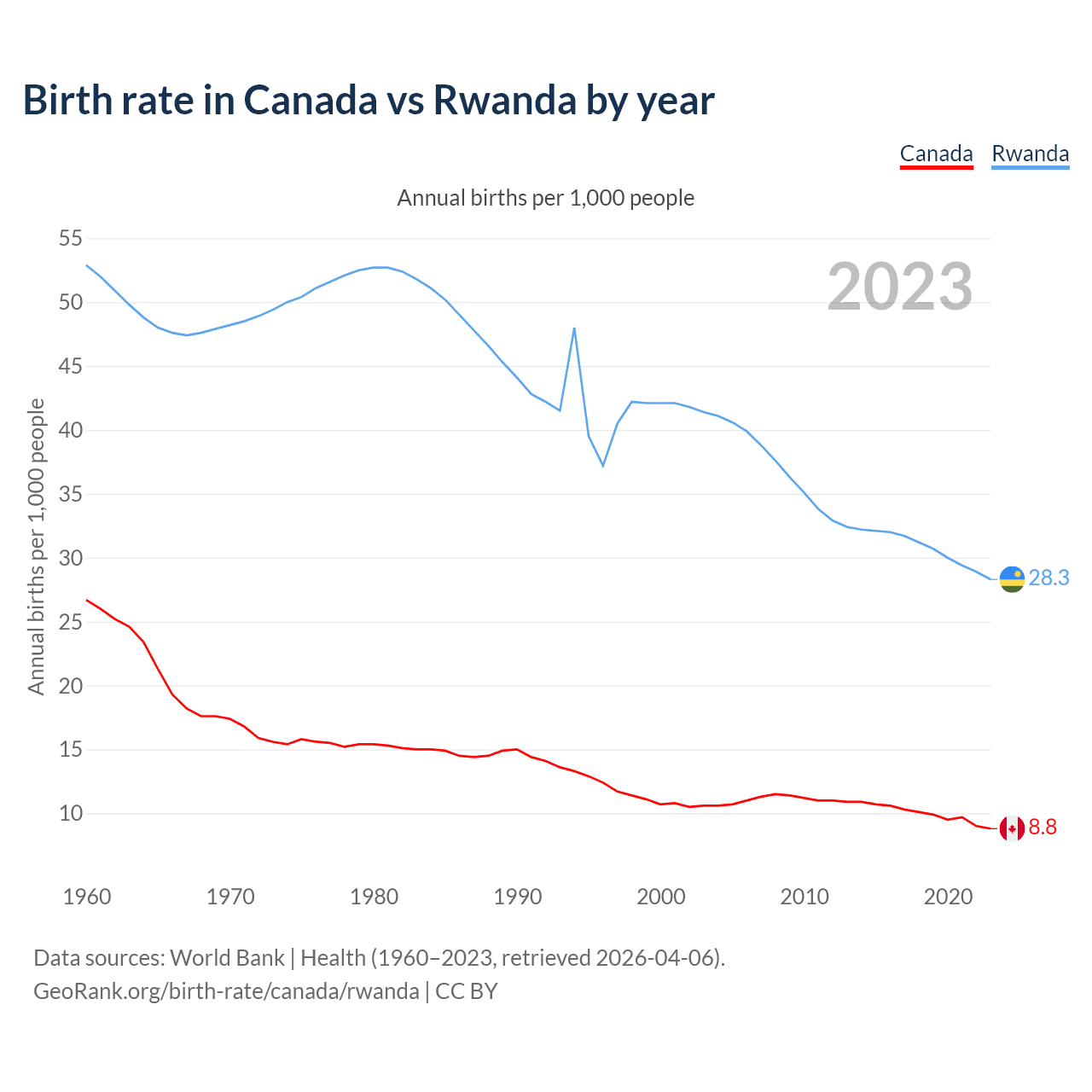 Canada has an annual birth rate of 8.8 births per 1,000 people, compared to 28.3 for Rwanda. The average number of children a woman is expected to have during her lifetime — the fertility rate, is 1.26 in Canada and 3.7 in Rwanda — 193.5% difference.