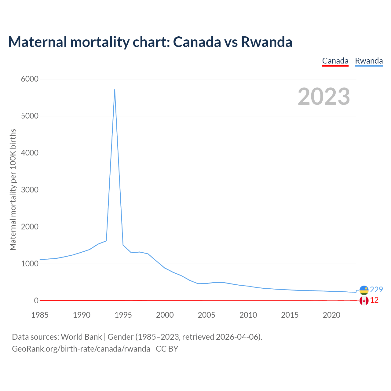 The maternal mortality rate, which is the probability of dying during childbirth or within 42 days of pregnancy termination, is 12 deaths per 100,000 live births in Canada, compared to 229 deaths in Rwanda.