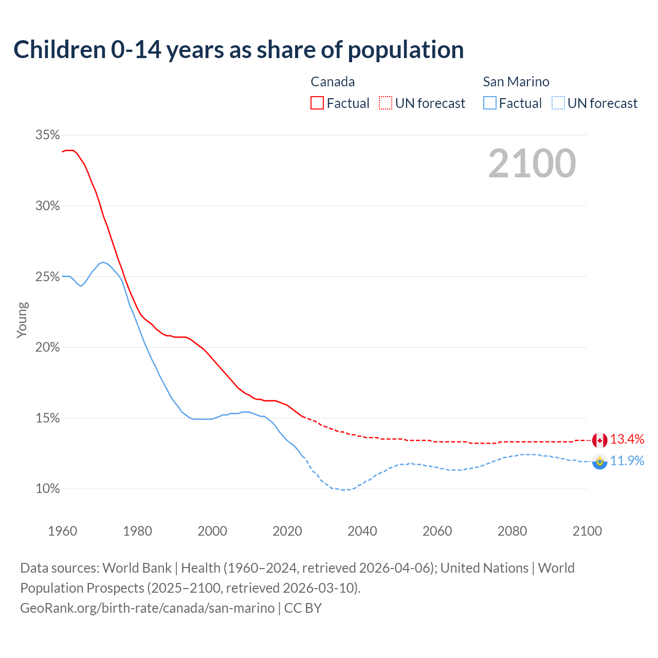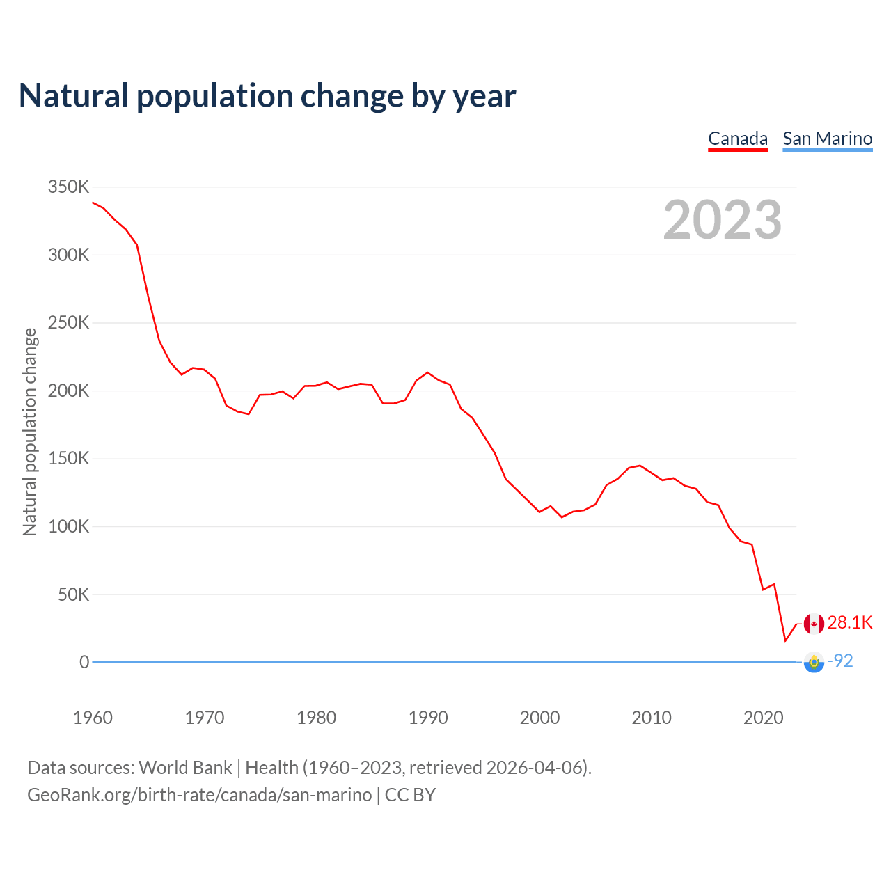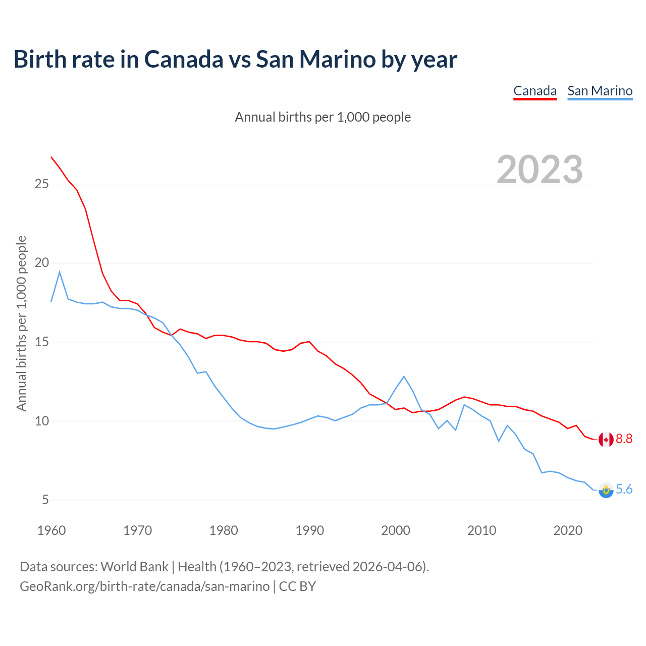 According to the latest available data on birth rates, the fertility rate in Canada was 1.26 children per woman in 2023, compared to 1.15 in San Marino in 2023. The replacement level is considered to be 2.1 children per woman.