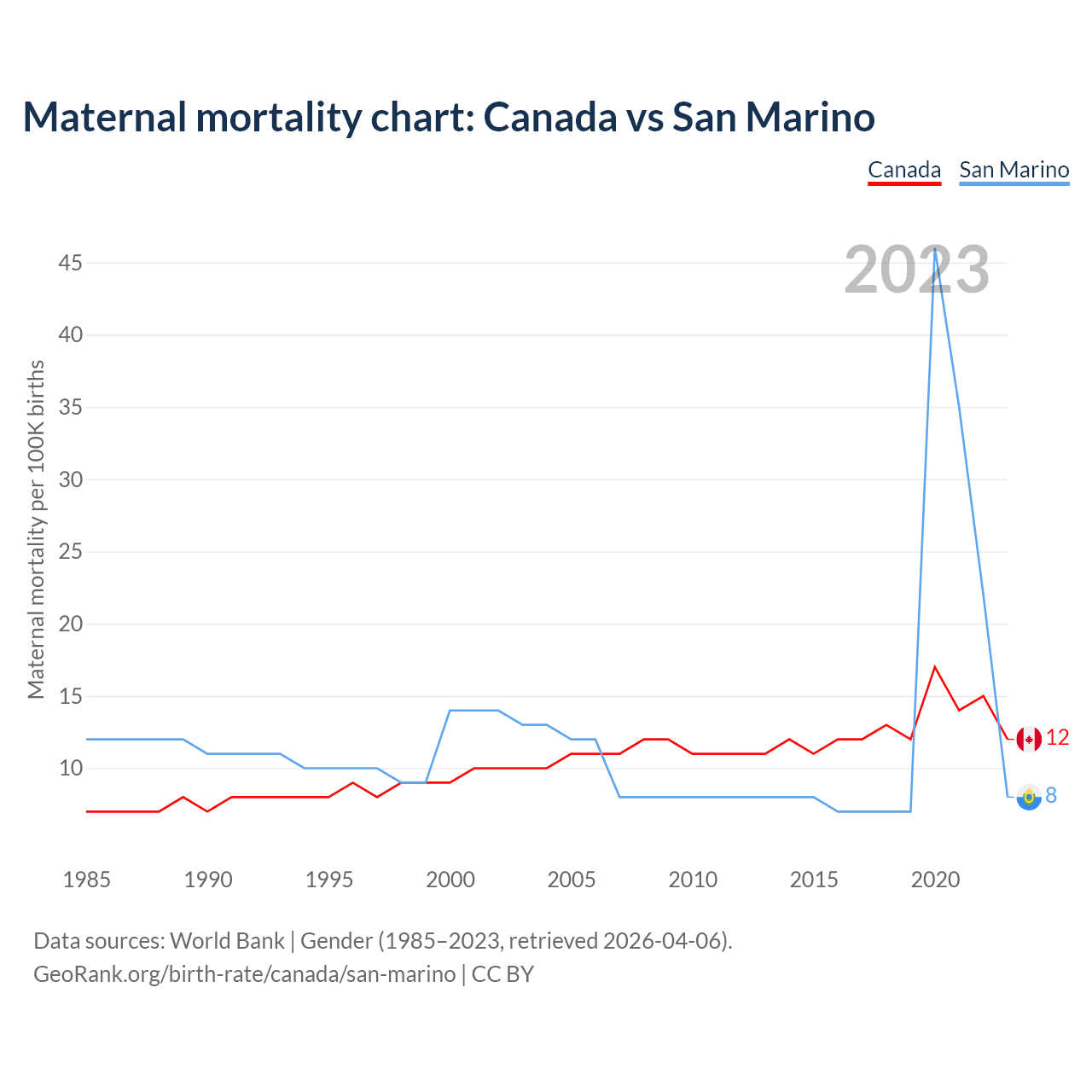 The maternal mortality rate, which is the probability of dying during childbirth or within 42 days of pregnancy termination, is 12 deaths per 100,000 live births in Canada, compared to 8 deaths in San Marino.