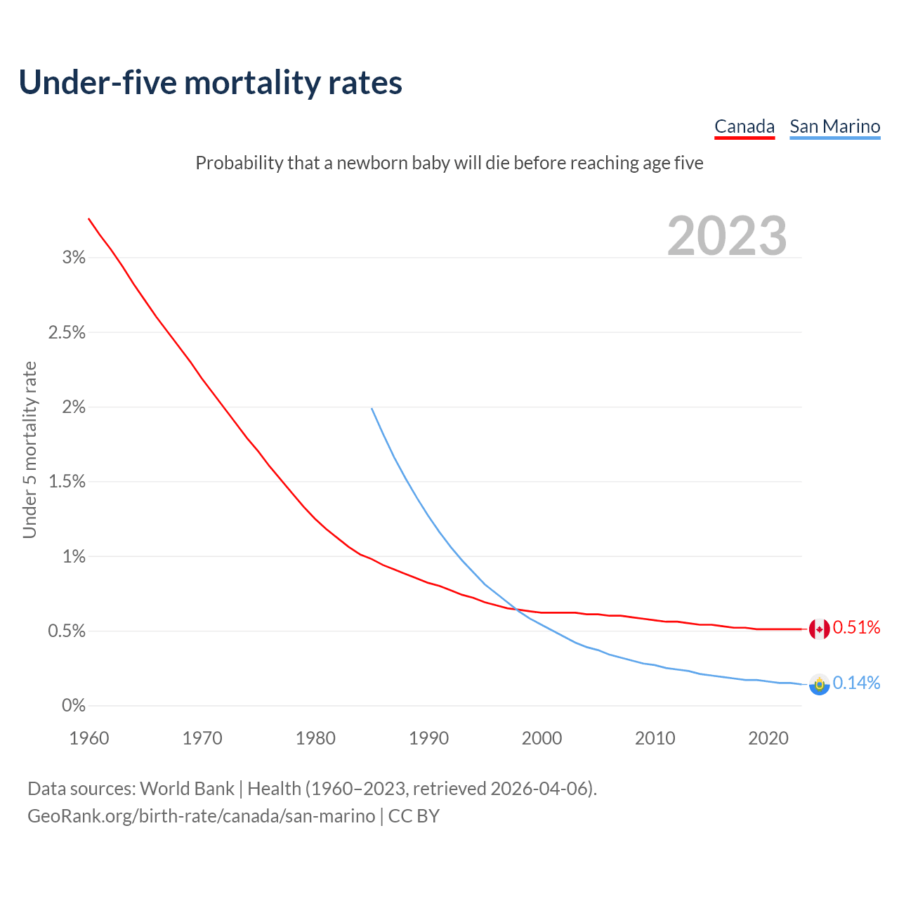 The chance that a newborn baby will die before reaching age five is 0.51% in Canada and 0.14% in San Marino. Above is a chart with historical data on under-five mortality rates.