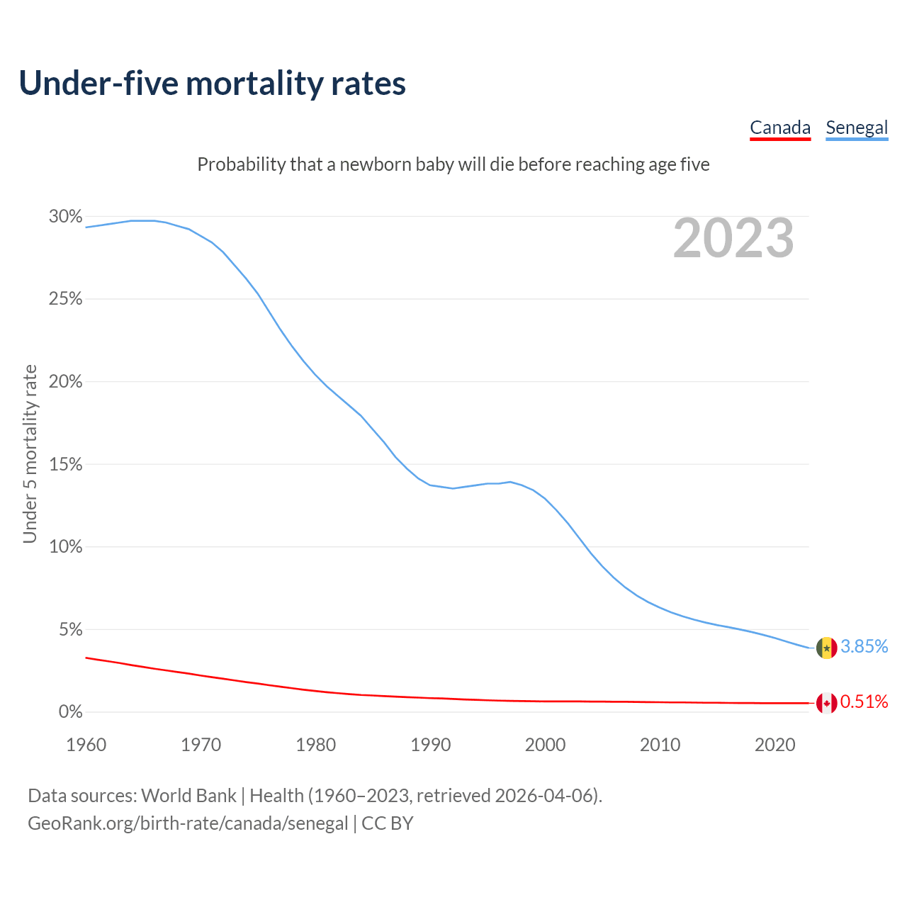 The chance that a newborn baby will die before reaching age five is 0.51% in Canada and 3.85% in Senegal. Above is a chart with historical data on under-five mortality rates.