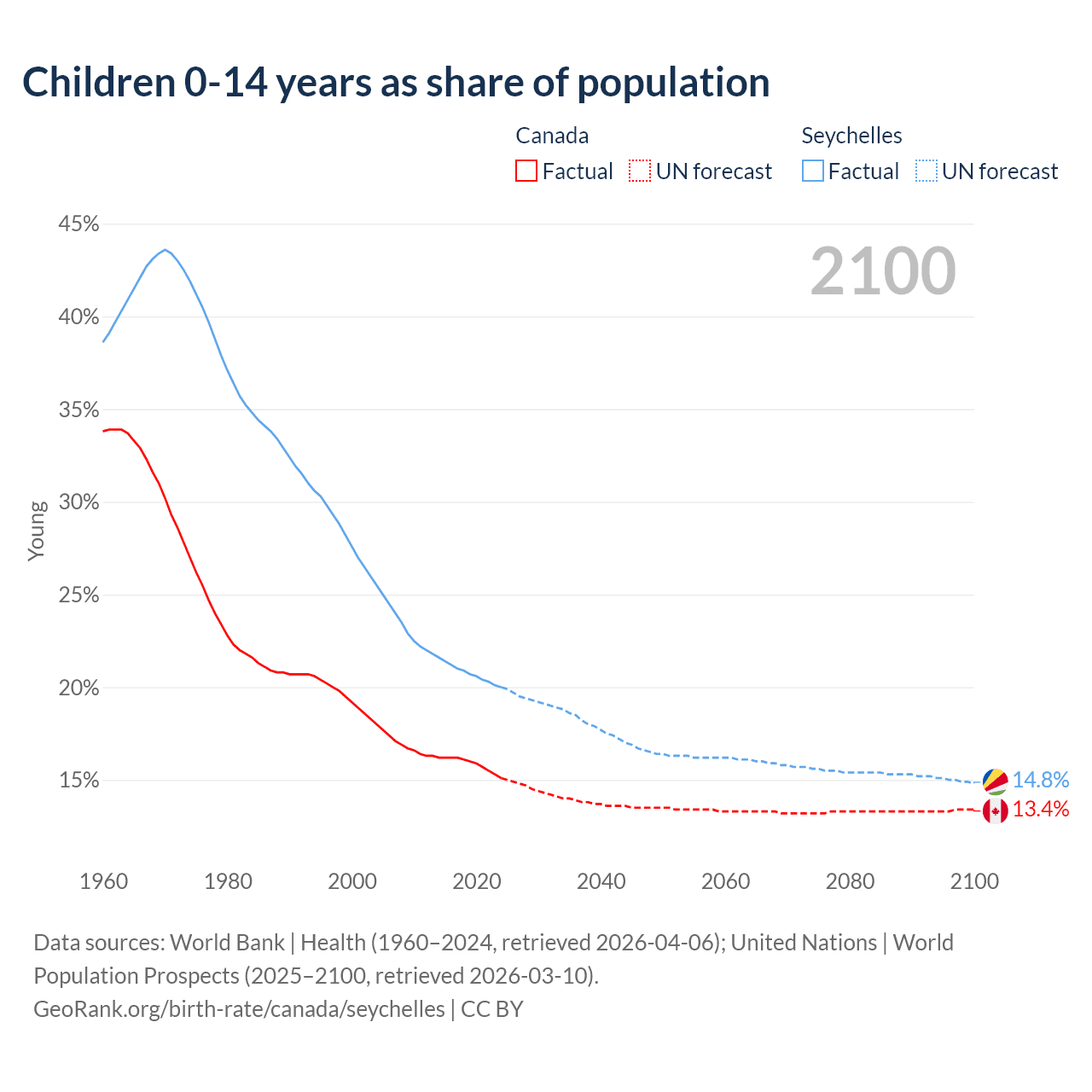 Canada has an annual birth rate of 8.8 births per 1,000 people, compared to 13 for the Seychelles. The average number of children a woman is expected to have during her lifetime — the fertility rate, is 1.26 in Canada and 2.02 in the Seychelles — 60.3% difference.