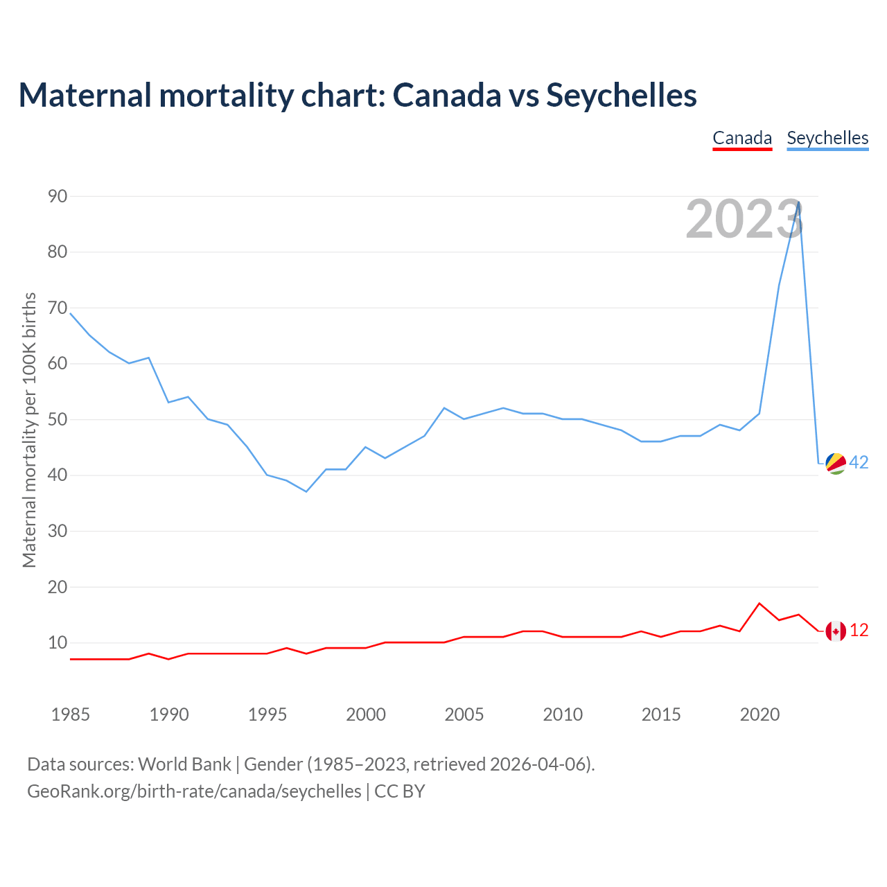 The maternal mortality rate, which is the probability of dying during childbirth or within 42 days of pregnancy termination, is 12 deaths per 100,000 live births in Canada, compared to 42 deaths in the Seychelles.