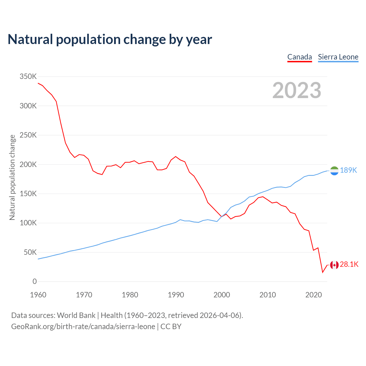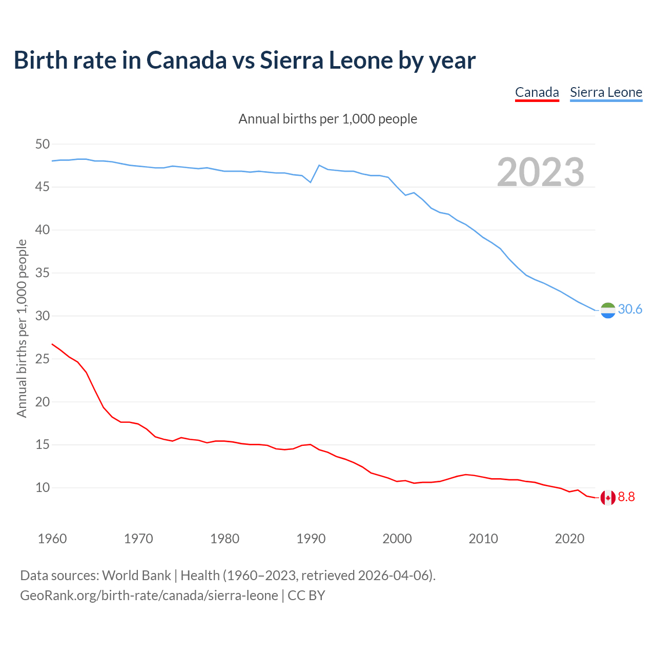 Canada has an annual birth rate of 8.8 births per 1,000 people, compared to 30.6 for Sierra Leone. The average number of children a woman is expected to have during her lifetime — the fertility rate, is 1.26 in Canada and 3.79 in Sierra Leone — 200.9% difference.