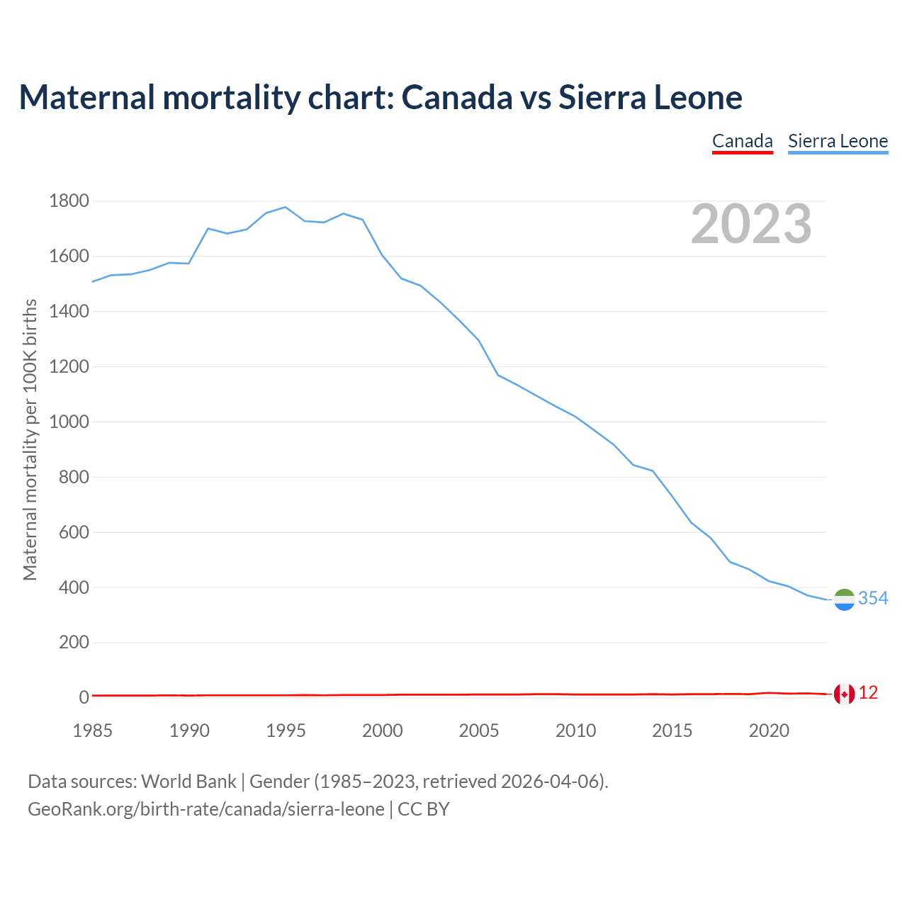 The maternal mortality rate, which is the probability of dying during childbirth or within 42 days of pregnancy termination, is 12 deaths per 100,000 live births in Canada, compared to 354 deaths in Sierra Leone.