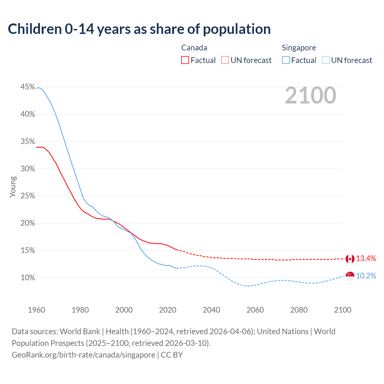 According to the latest available data on birth rates, the fertility rate in Canada was 1.26 children per woman in 2023, compared to 0.97 in Singapore in 2023. The replacement level is considered to be 2.1 children per woman.