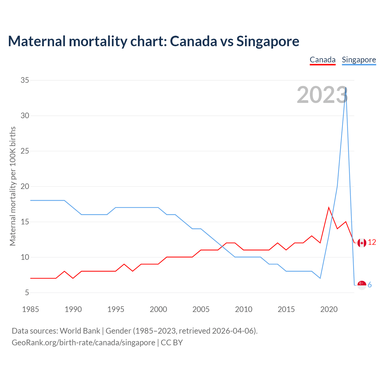 The maternal mortality rate, which is the probability of dying during childbirth or within 42 days of pregnancy termination, is 12 deaths per 100,000 live births in Canada, compared to 6 deaths in Singapore.