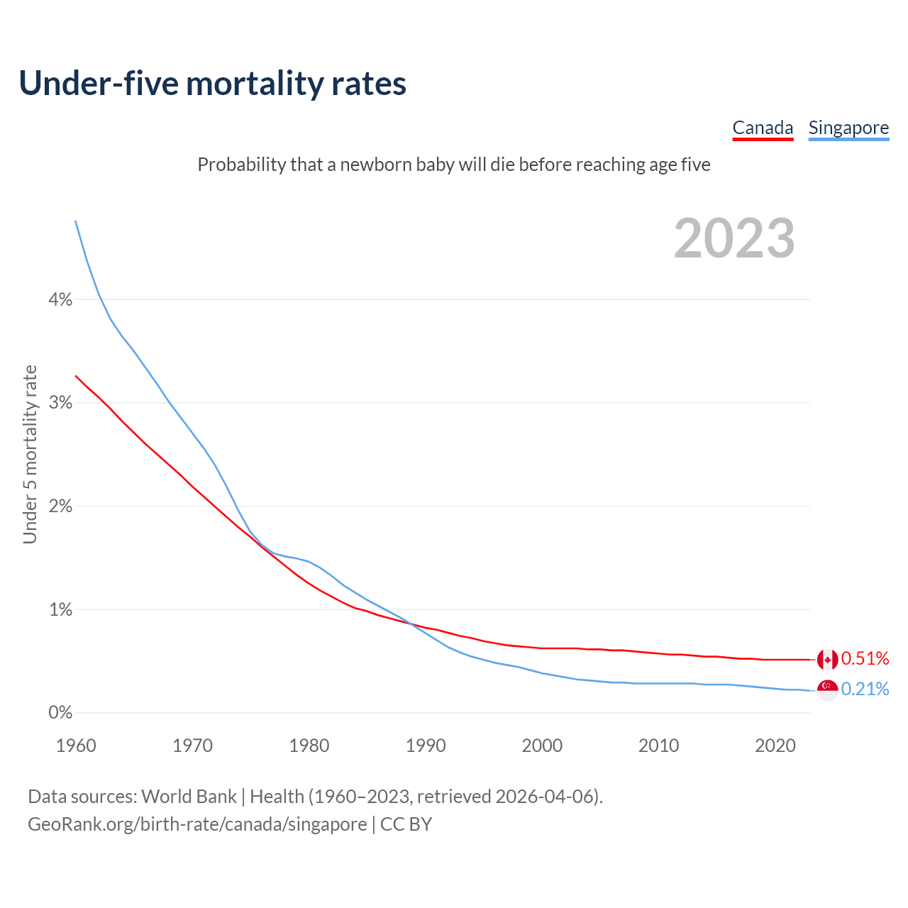 The chance that a newborn baby will die before reaching age five is 0.51% in Canada and 0.21% in Singapore. Above is a chart with historical data on under-five mortality rates.