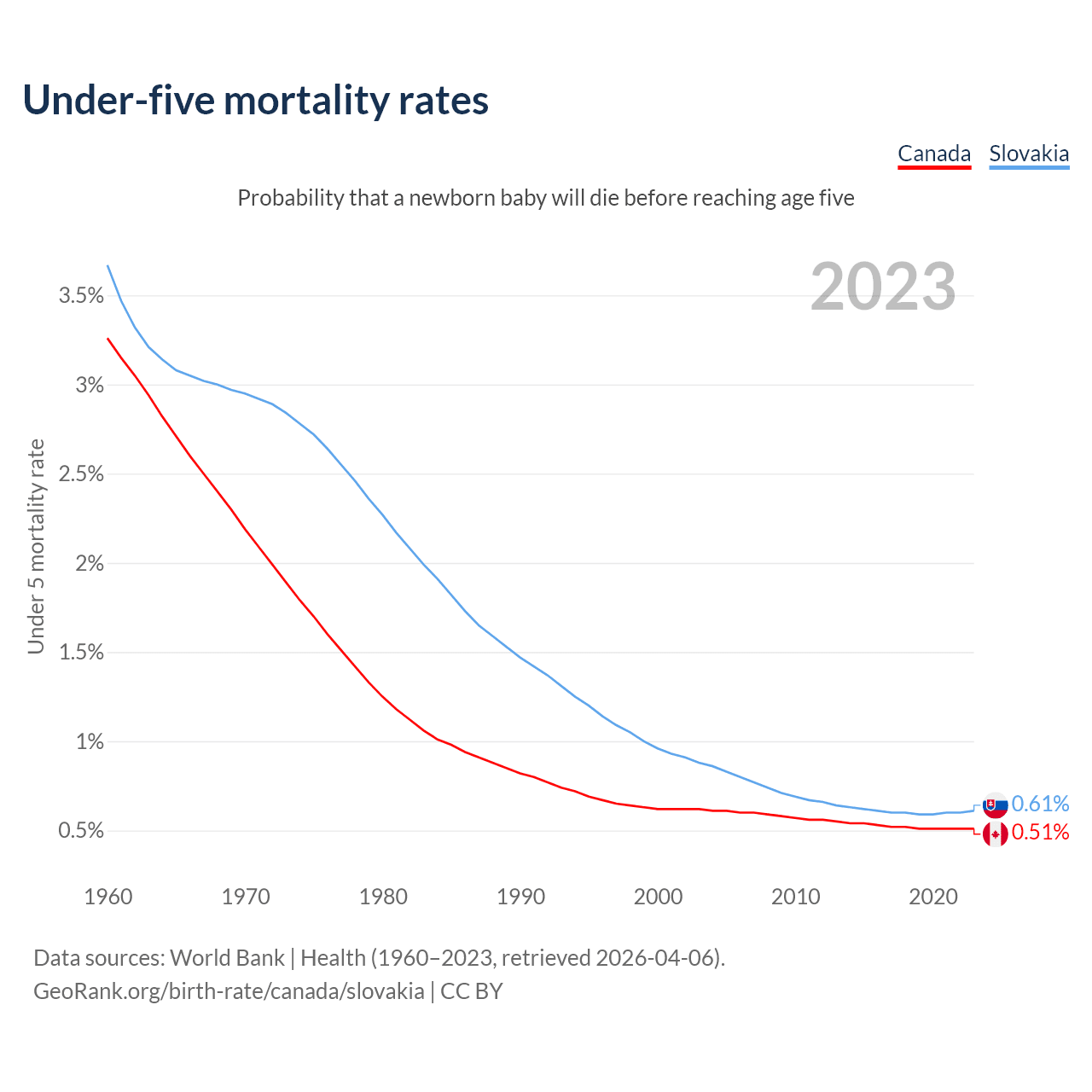 The chance that a newborn baby will die before reaching age five is 0.51% in Canada and 0.61% in Slovakia. Above is a chart with historical data on under-five mortality rates.