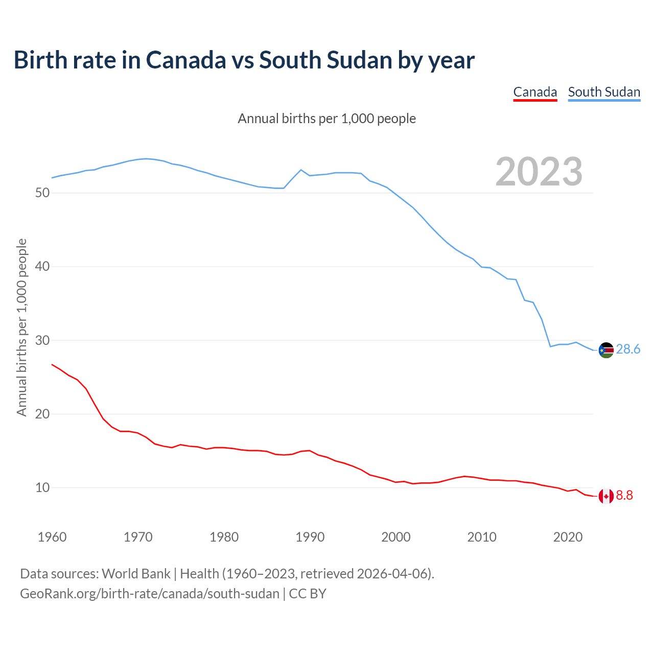 Canada has an annual birth rate of 8.8 births per 1,000 people, compared to 28.6 for South Sudan. The average number of children a woman is expected to have during her lifetime — the fertility rate, is 1.26 in Canada and 3.86 in South Sudan — 206.7% difference.