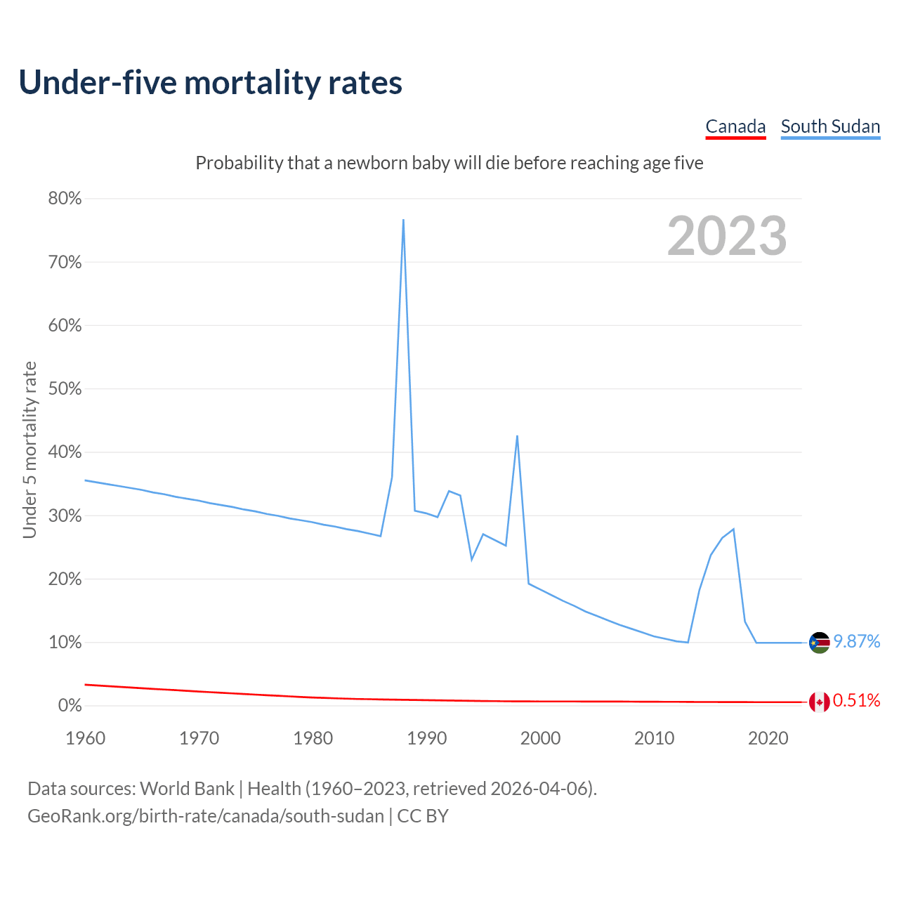 The chance that a newborn baby will die before reaching age five is 0.51% in Canada and 9.87% in South Sudan. Above is a chart with historical data on under-five mortality rates.