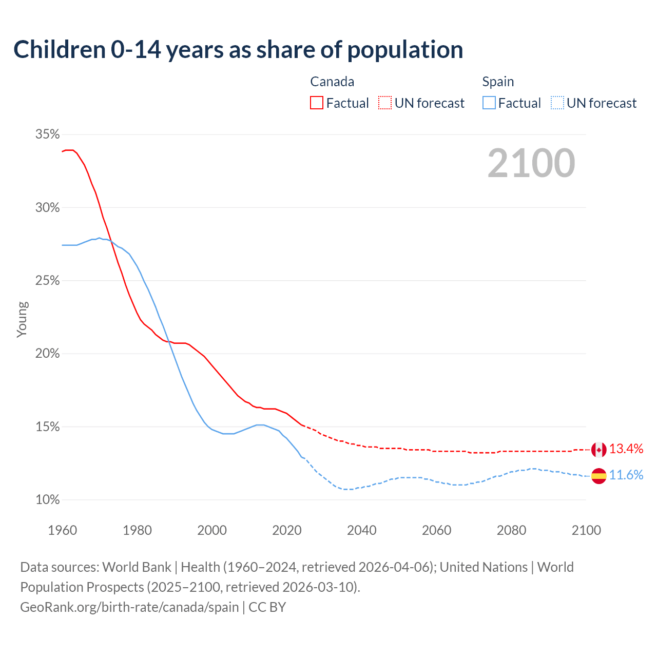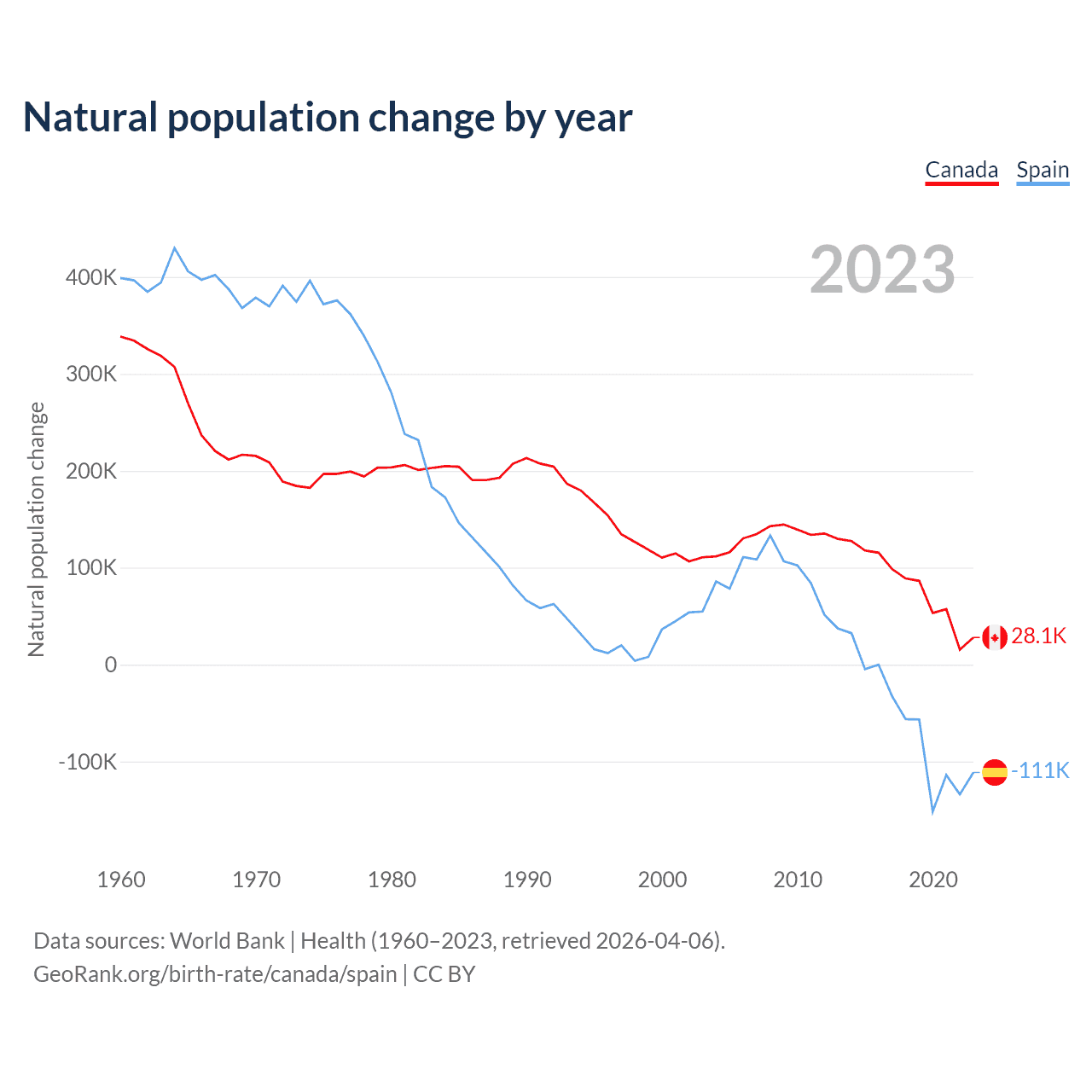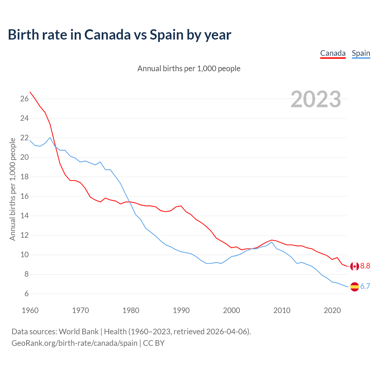 According to the latest available data on birth rates, the fertility rate in Canada was 1.26 children per woman in 2023, compared to 1.12 in Spain in 2023. The replacement level is considered to be 2.1 children per woman.
