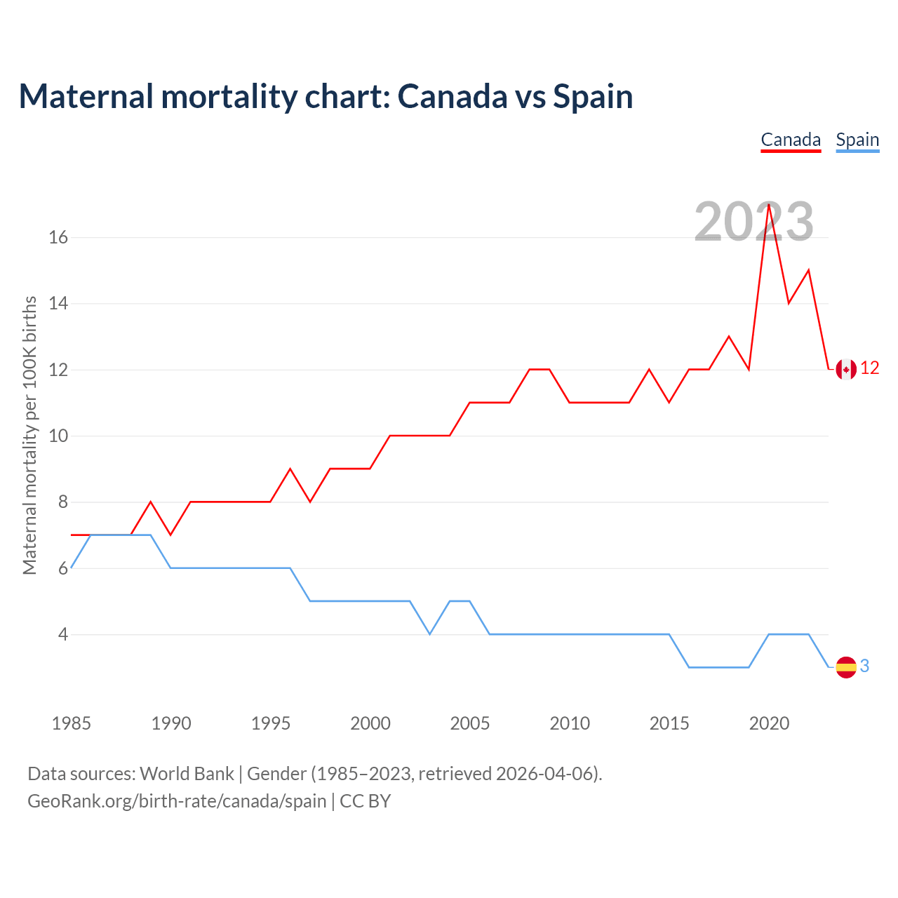 The maternal mortality rate, which is the probability of dying during childbirth or within 42 days of pregnancy termination, is 12 deaths per 100,000 live births in Canada, compared to 3 deaths in Spain.