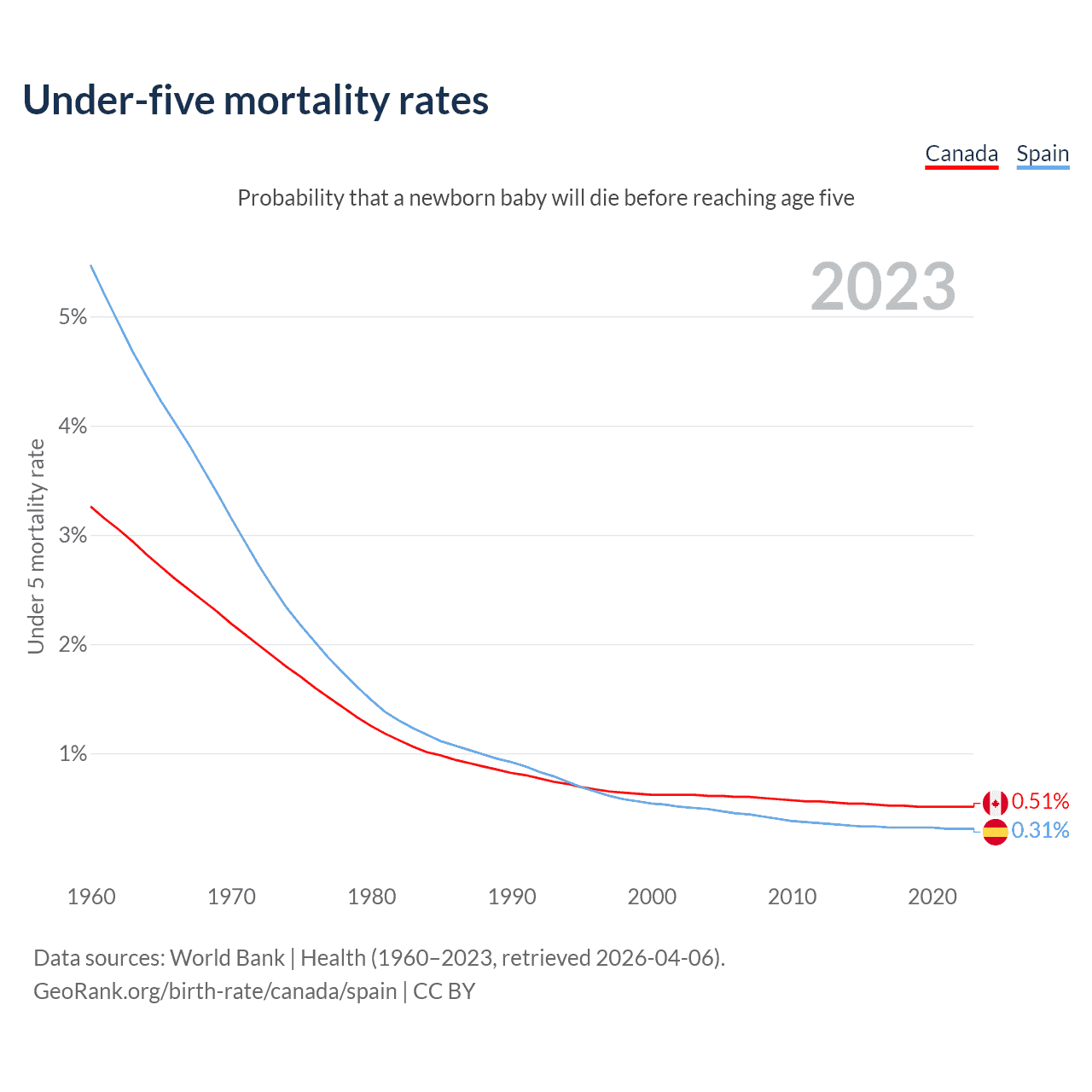 The chance that a newborn baby will die before reaching age five is 0.51% in Canada and 0.31% in Spain. Above is a chart with historical data on under-five mortality rates.