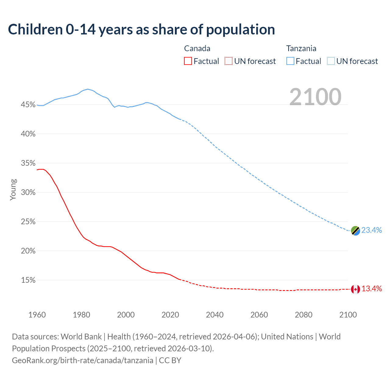 Canada has an annual birth rate of 8.8 births per 1,000 people, compared to 35.2 for Tanzania. The average number of children a woman is expected to have during her lifetime — the fertility rate, is 1.26 in Canada and 4.61 in Tanzania — 265.6% difference.