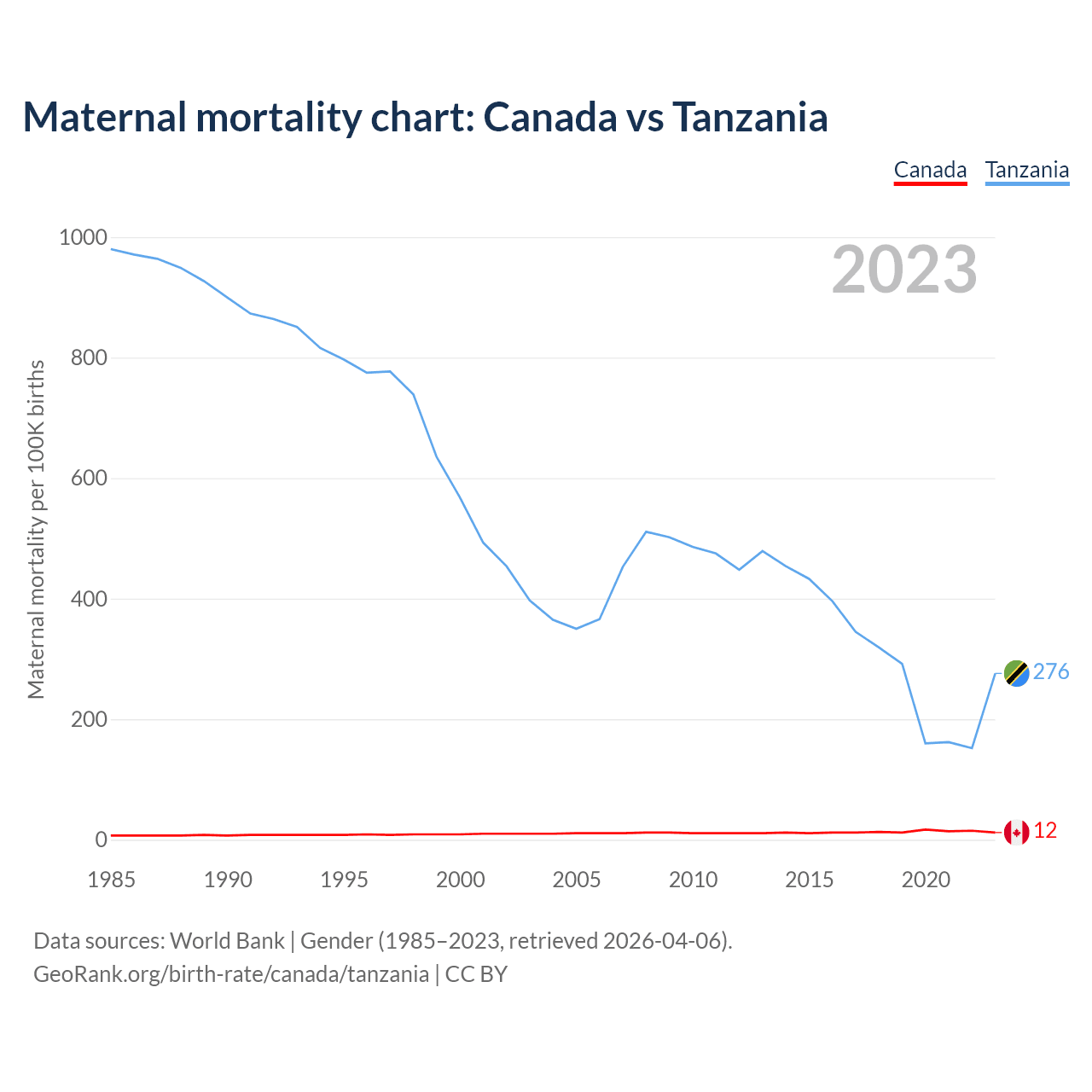 The maternal mortality rate, which is the probability of dying during childbirth or within 42 days of pregnancy termination, is 12 deaths per 100,000 live births in Canada, compared to 276 deaths in Tanzania.