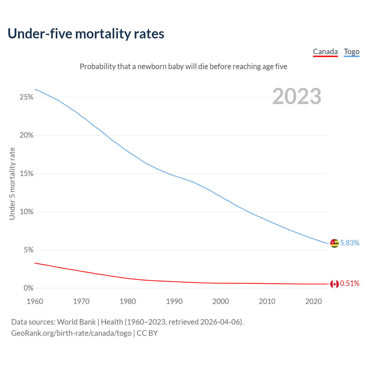 The chance that a newborn baby will die before reaching age five is 0.51% in Canada and 5.83% in Togo. Above is a chart with historical data on under-five mortality rates.