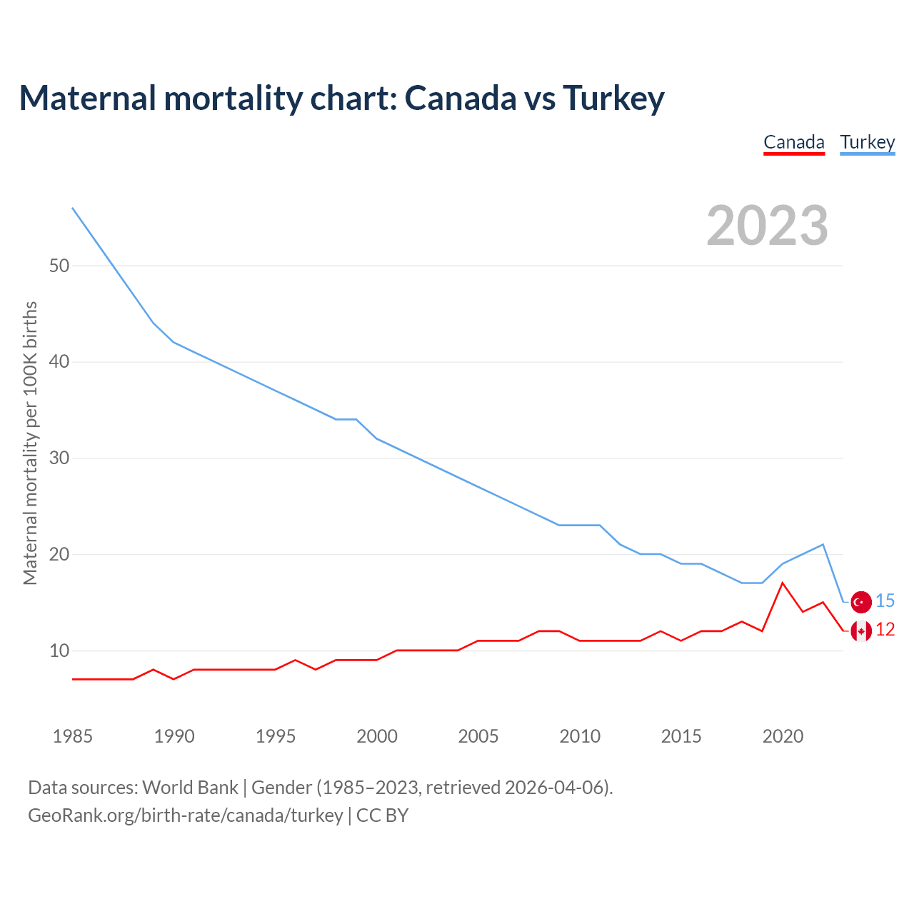 The maternal mortality rate, which is the probability of dying during childbirth or within 42 days of pregnancy termination, is 12 deaths per 100,000 live births in Canada, compared to 15 deaths in Turkey.