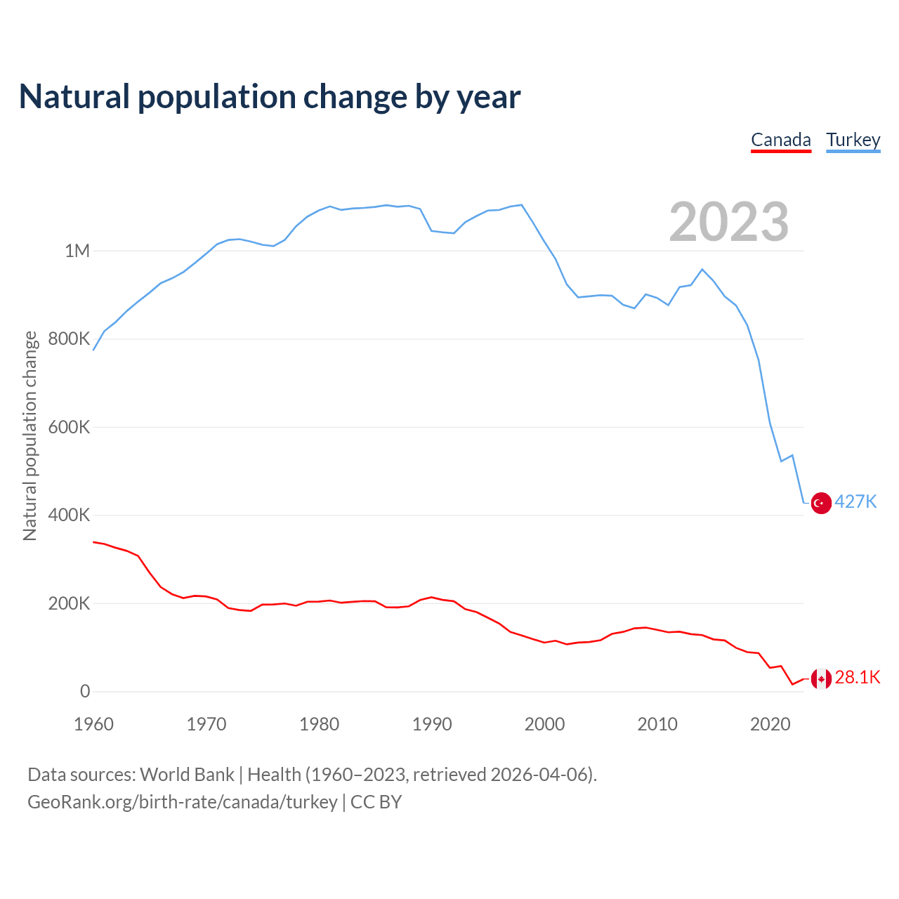 According to the latest available data on birth rates, the fertility rate in Canada was 1.26 children per woman in 2023, compared to 1.51 in Turkey in 2023. The replacement level is considered to be 2.1 children per woman.