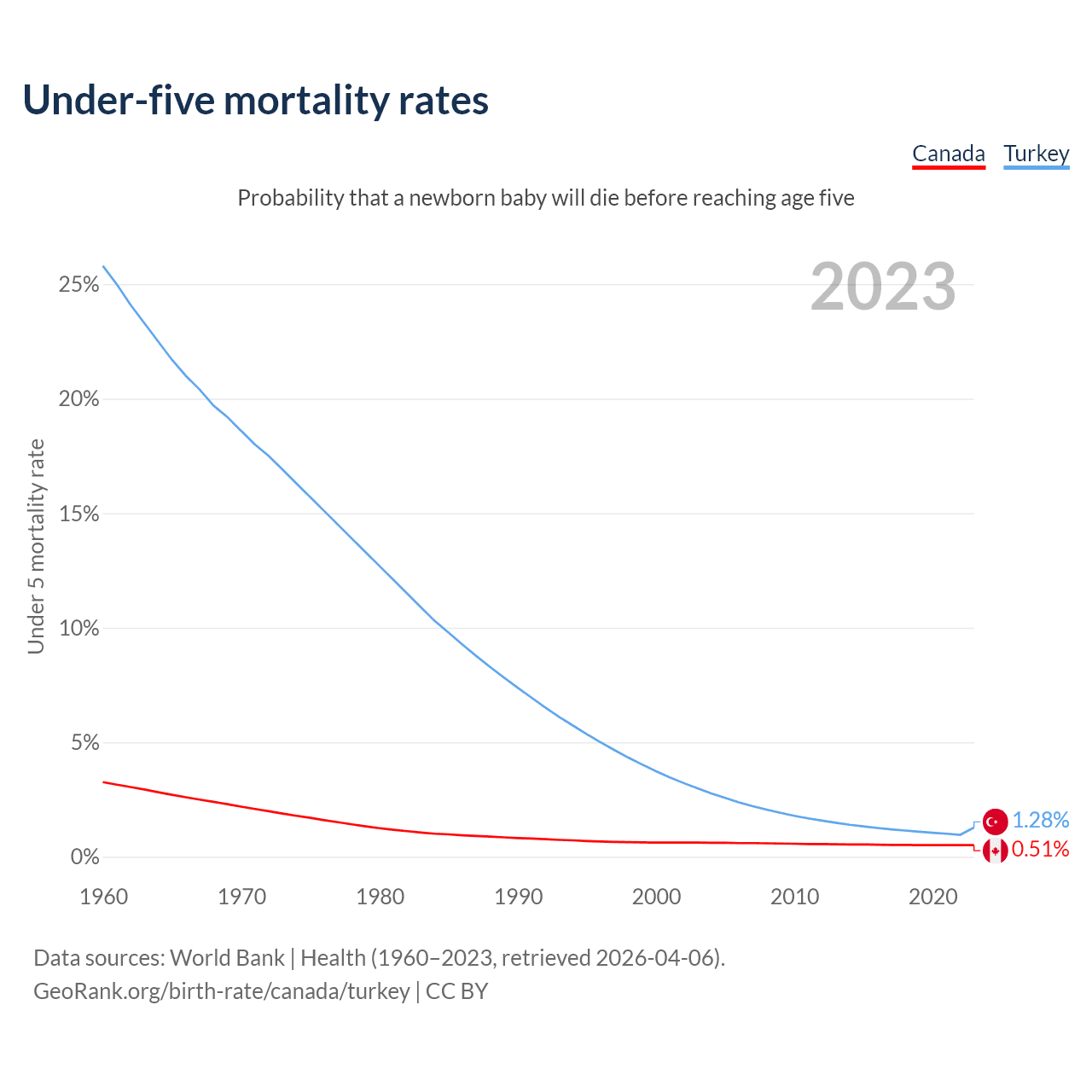 The chance that a newborn baby will die before reaching age five is 0.51% in Canada and 1.28% in Turkey. Above is a chart with historical data on under-five mortality rates.