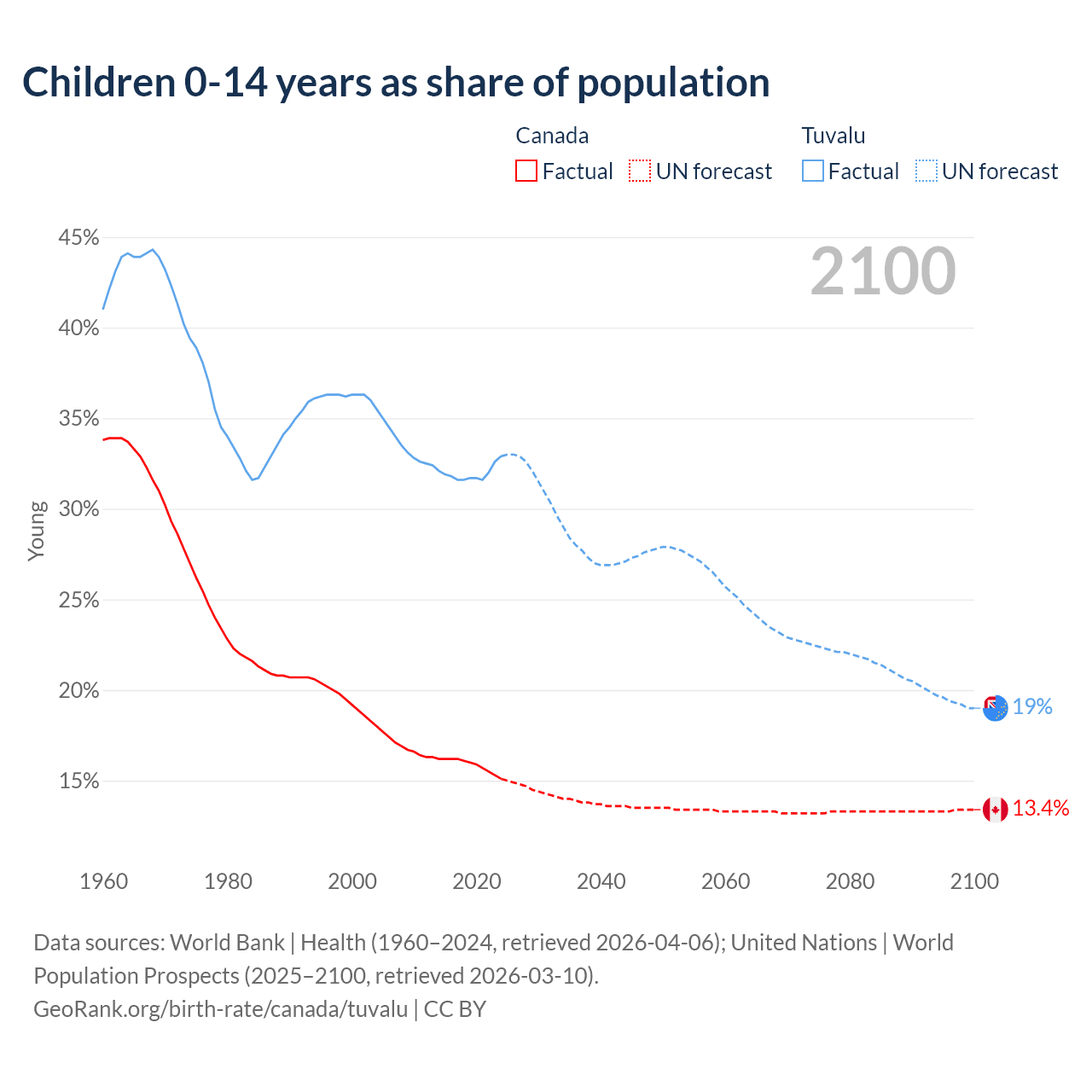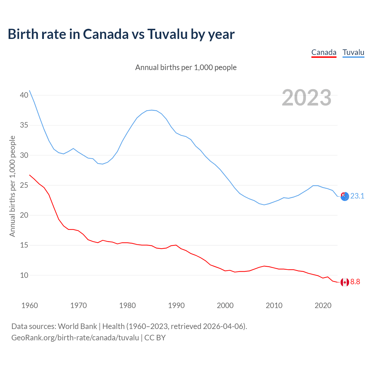 Canada has an annual birth rate of 8.8 births per 1,000 people, compared to 23.1 for Tuvalu. The average number of children a woman is expected to have during her lifetime — the fertility rate, is 1.26 in Canada and 3.21 in Tuvalu — 154.6% difference.