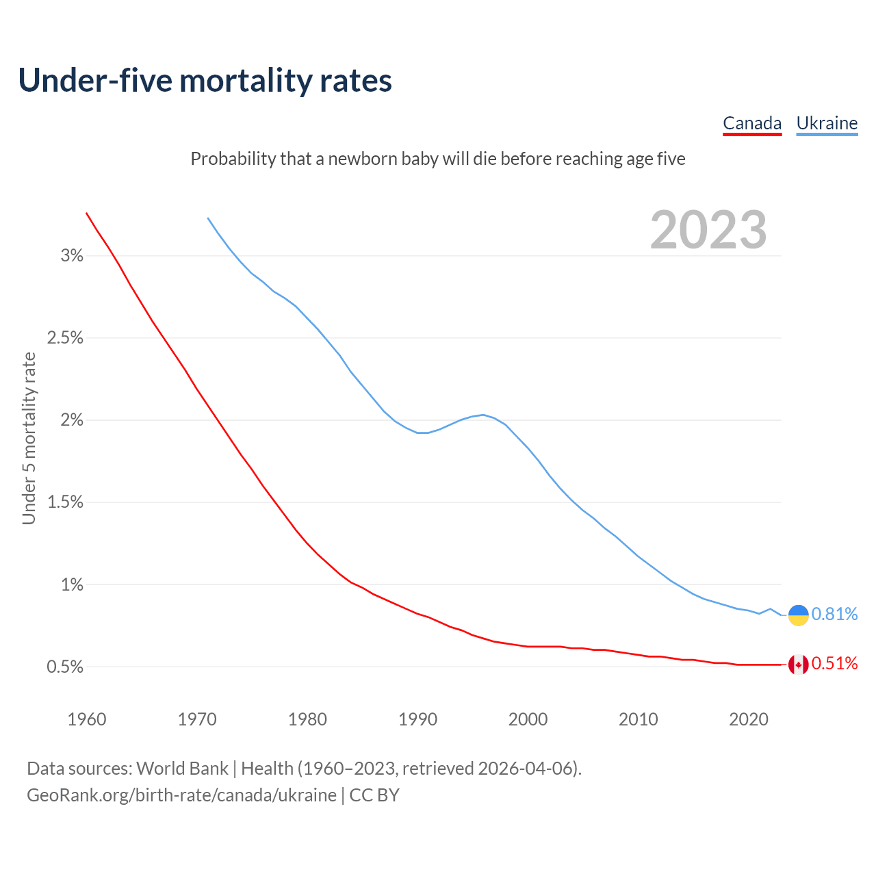 The chance that a newborn baby will die before reaching age five is 0.51% in Canada and 0.81% in Ukraine. Above is a chart with historical data on under-five mortality rates.